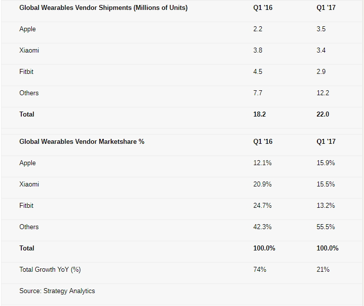 Fitbit ушла с первой позиции (4,5 млн. в первом квартале 2016 года) на третье (2,9 млн. в первом квартале 2017 года), что стало серьезным спадом.