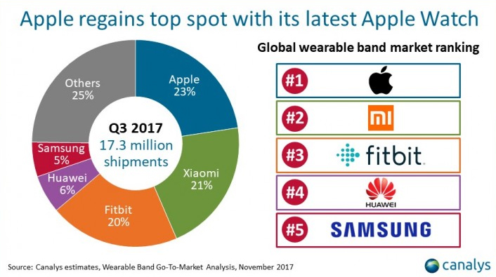 В третьем квартале 2017 года Apple снова стала лидером на рынке носимых аксессуаров. Компания, делающая Apple Watch, оказалась в лидерах и в первом квартале, но во втором квартале ее обогнали Xiaomi и Fitbit.