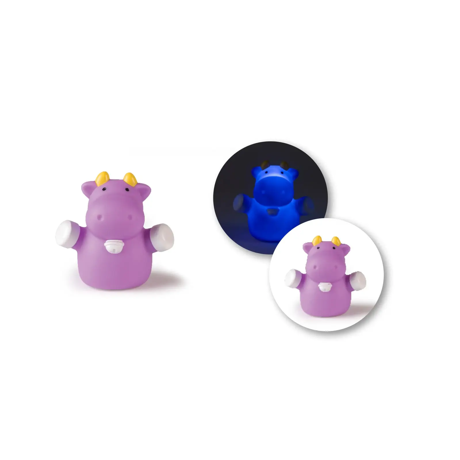 Мініатюрний нічничок «Корівка» 0м + висотою 8 см фіолетового кольору створює затишне приглушене нічне освітлення, ідеяльне для спокійного засинання дитини в компанії аксесуара у вигляді улюбленої тварини. Завдяки вбудованому в каганець светодиоду холодного світіння, виріб не нагрівається, виготовлений з якісного нетоксичного, приємного на дотик пластику, що легко чиститься. Працює від 3х батарейок LR44 / AG13 (входять в комплект).