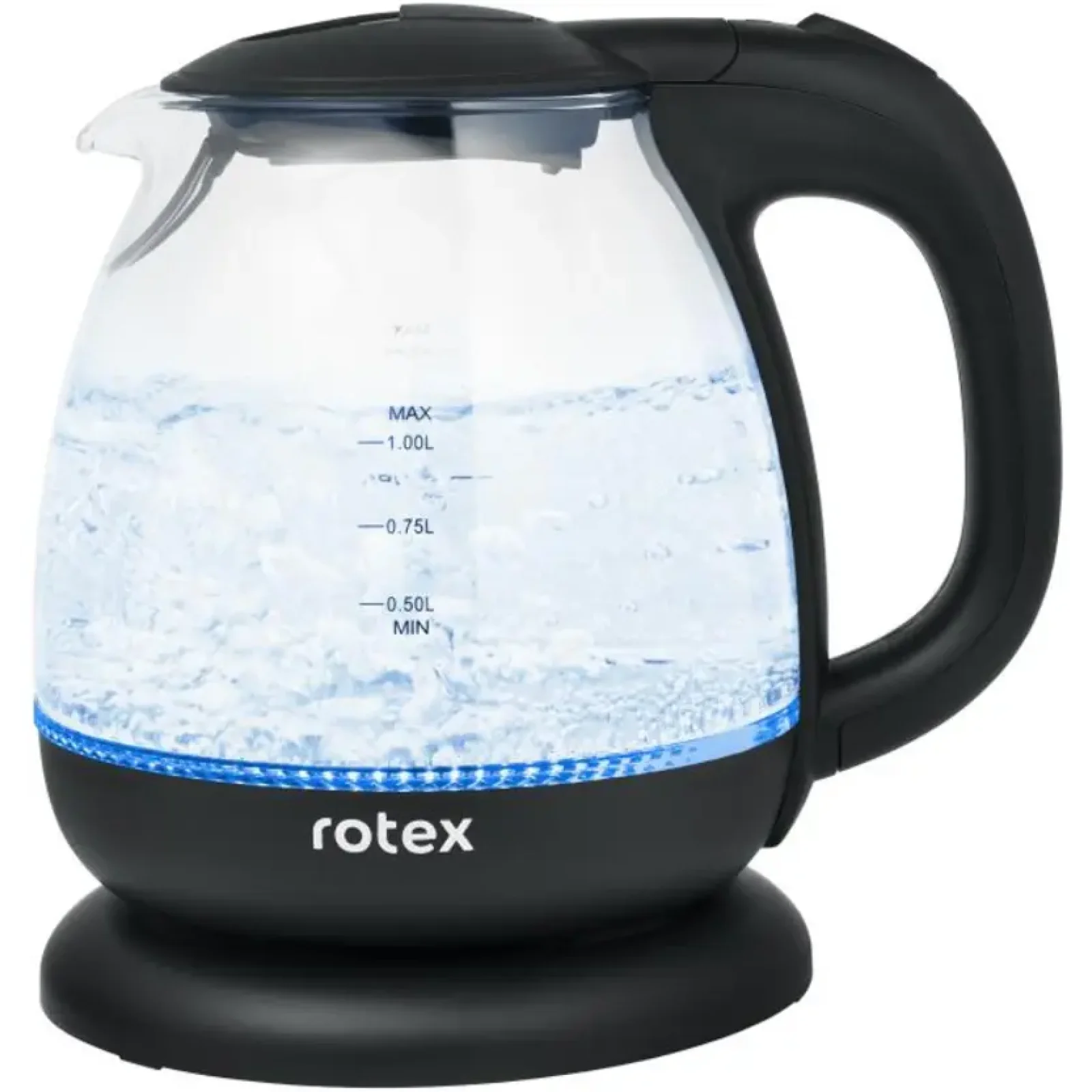 Живлення - 220-240В, 50Гц, потужність 1100Вт, ємність 1 л, закритий нагрівальний елемент з нержавіючої сталі, автоматичне відключення при закипанні, захист від протікання, шкала рівня води, LED підсвітка, знімний фільтр, матеріал корпусу: міцне термостійке скло, колір пластика чорний.