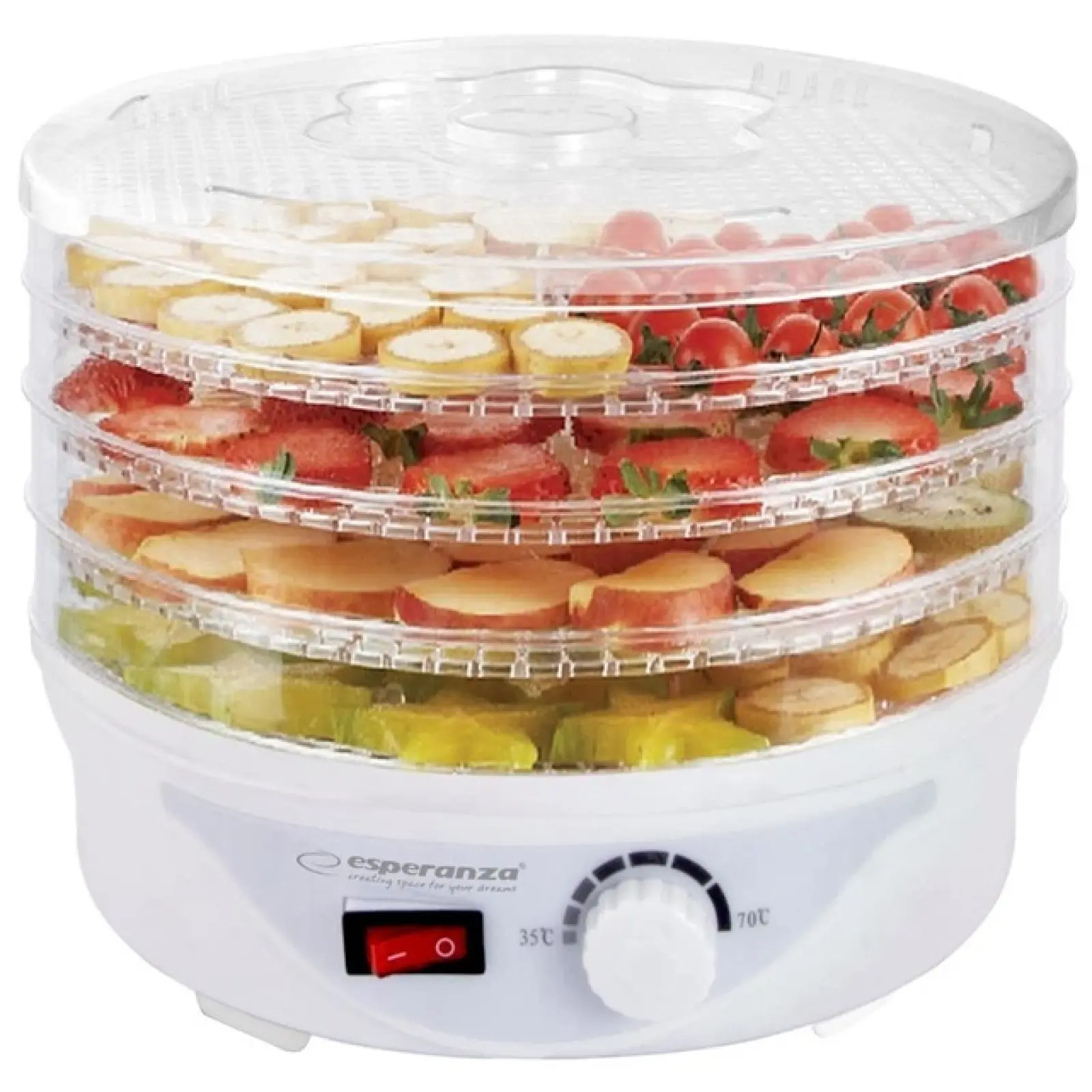 Esperanza EKD003 оснащена надежной системой защиты от перегрева, которая автоматически отключает нагревательный элемент при достижении критической температуры, предотвращая поломку и обеспечивая пожарную безопасность. Прочный пластик корпуса устойчив к высоким температурам, не выделяет посторонних запахов и легко очищается после использования. Это простое в управлении и долговечное устройство станет вашим лучшим помощником в создании полезных снеков и зимних запасов.