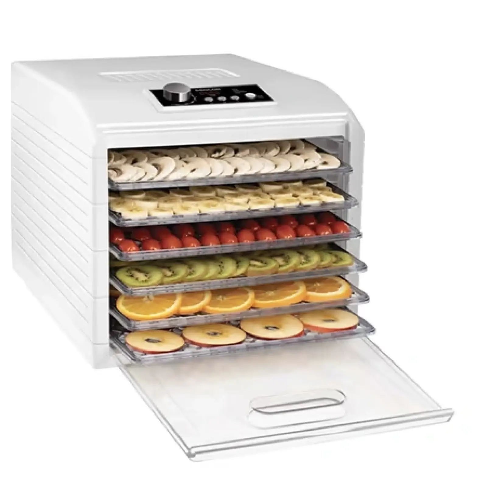 Sencor SFD 6500WH оснащена интуитивно понятным LED-дисплеем и электронным контролем температуры в диапазоне от 35°C до 70°C. Для максимального удобства в прибор встроено 5 автоматических программ сушки (для мяса, фруктов, грибов, трав и пастилы), которые сами подберут оптимальное время и нагрев. Также предусмотрен электронный таймер для автоматического выключения, что позволяет оставить прибор работать даже ночью.