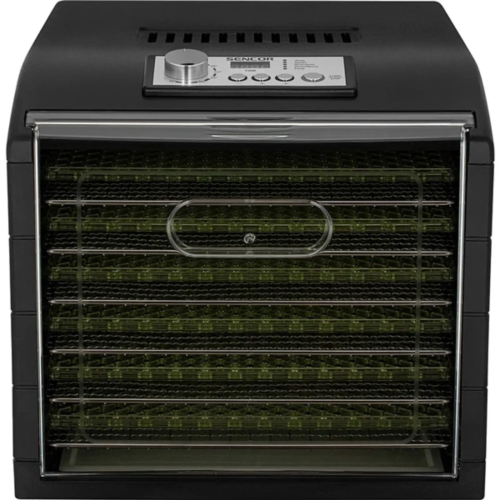 Sencor SFD 6601BK укомплектована 6 поддонами из высококачественного термостойкого пластика, которые не содержат BPA (бисфенол А). Прямоугольная форма поддонов обеспечивает полезную площадь в 0,59 м², позволяя за один цикл приготовить внушительный запас полезных снеков. Прозрачная дверца с магнитным замком позволяет наблюдать за процессом, не нарушая температурный режим внутри камеры.