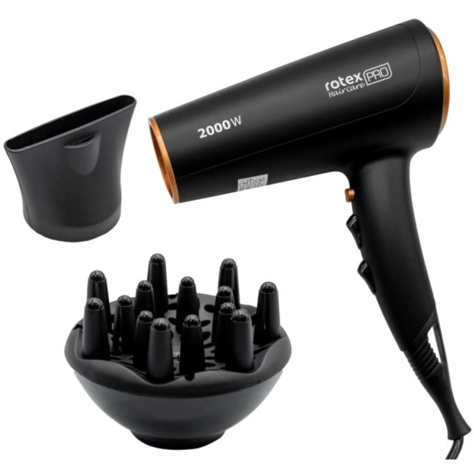 Живлення - 220-240В, 50Гц, Потужність 2000 Вт, 2 швидкості, 3 температурних режими, кнопка холодного повітря, дифузор, насадка-концентратор, колір: матовий чорний.