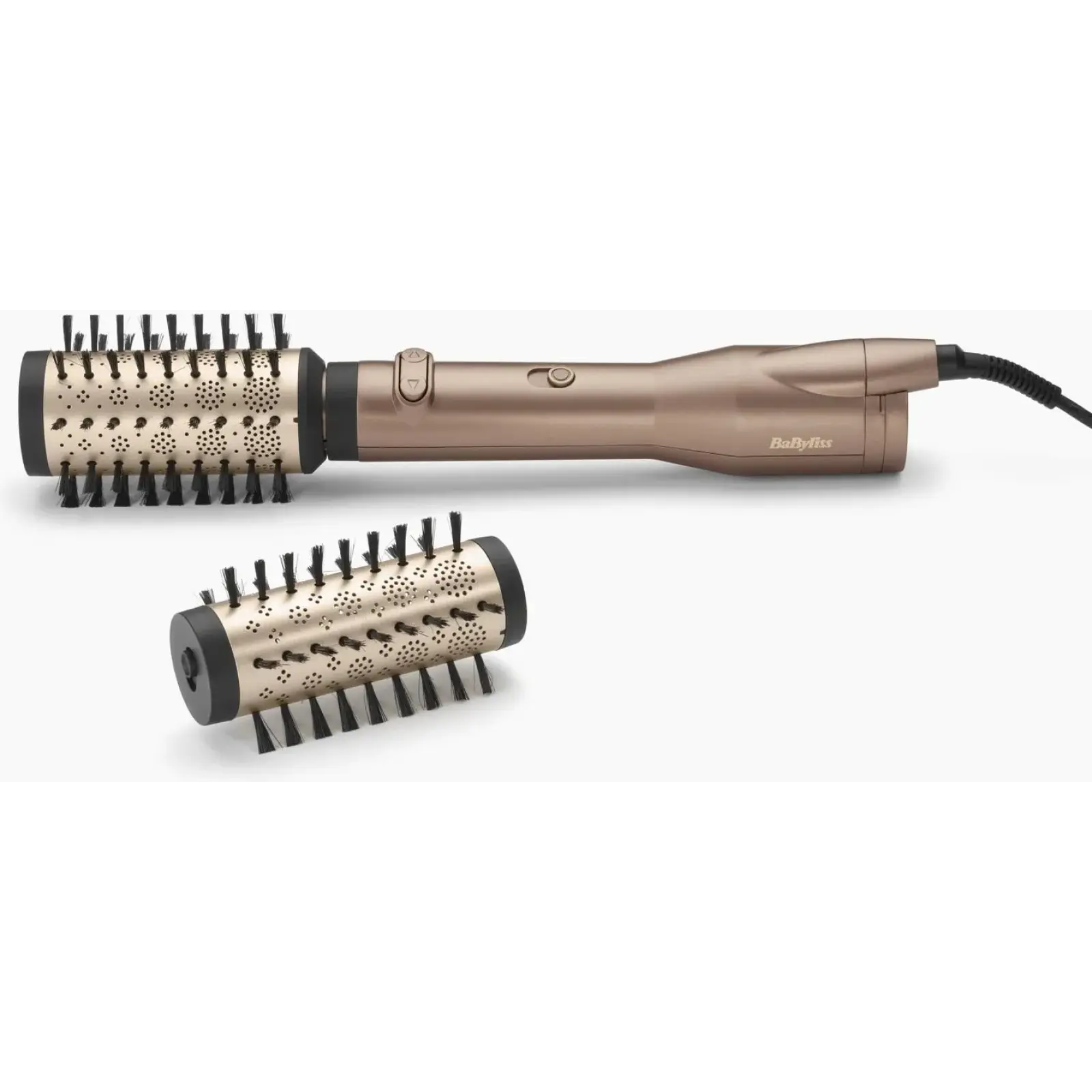 В комплект входят две круглые щётки разного диаметра, которые вращаются в обе стороны. Это позволяет создавать внутренний или внешний завиток, формировать прикорневой объём или выравнивать длину. Щетина мягко прочёсывает волосы, обеспечивая равномерное распределение тепла и аккуратный результат.