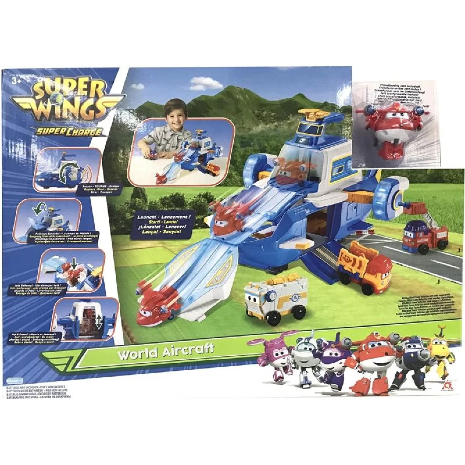 Всі пригоди починаються і закінчуються в Світовому Аеропорту. Цей рухомий літак прибув сюди з нового сезону Super Wings Super-Charge і є домом для Джетта і його друзів з Super Wings. Використовуйте ручку літака, щоб літати на базі по небу, або використовуйте колеса і їздите по землі. Підготуйте своїх персонажів Super Wings до зльоту, натиснувши на спусковий гачок на ручці і спостерігайте, як злітно-посадкова смуга розкладається! Ліфт в задній частині ігрового набору дозволяє запускати персонажів Transform a Bots, є навіть бічні двері сховища.Набір обладнаний світловим та звуковим супроводом, а також у комплект входить фігурка Jett Transform a Bot. Для роботи потрібні 3 батареї AAA, не входять до комплекту.