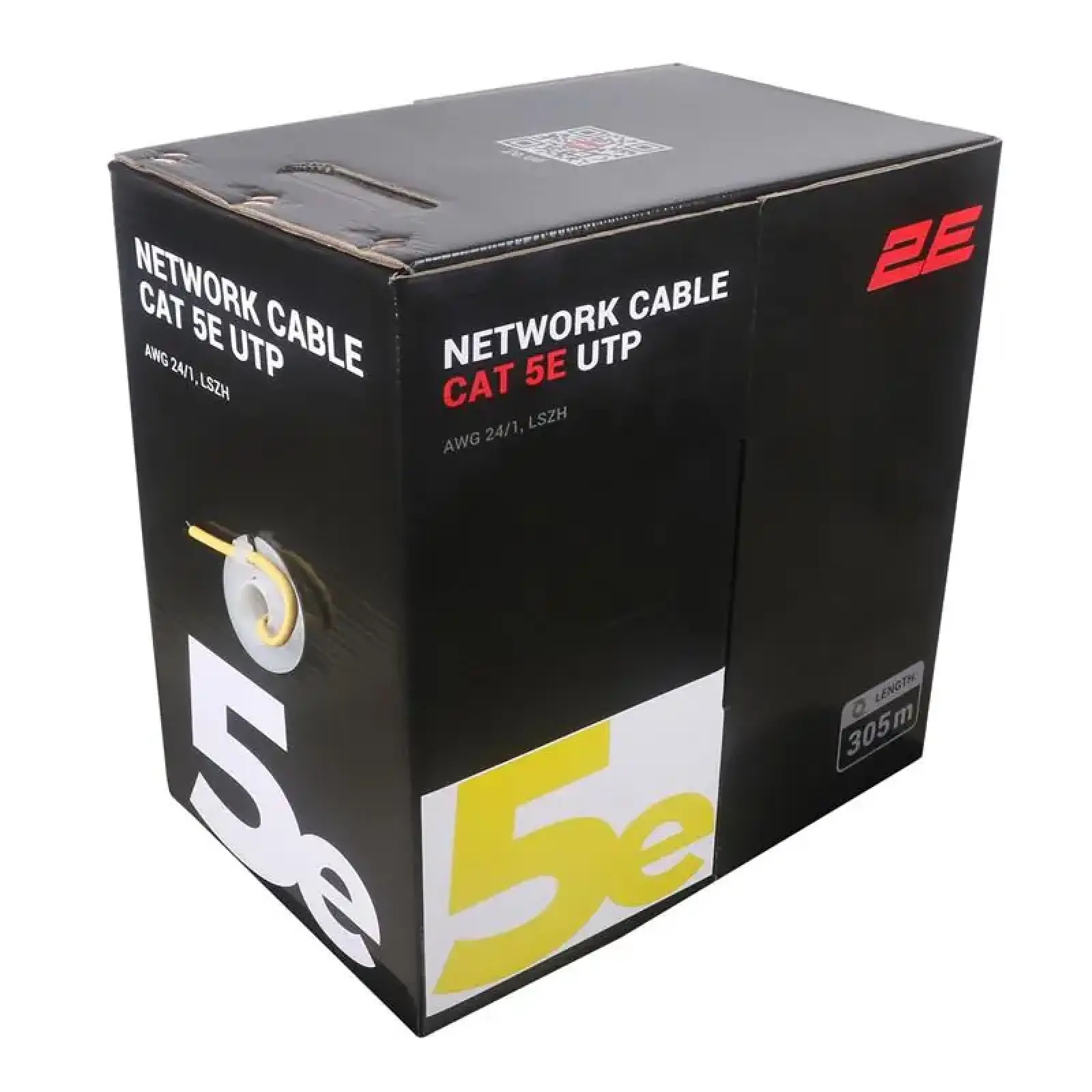 Монтажні кабелі 2E® Категорія 5е U-UTP виготовлено та випробувано відповідно до ISO/IEC 11801, TIA/EIA 568B і EN 50173 Category 5е. Кожен кабель складається з 8 провідників AWG 24 з кольоровим маркуванням у поліетиленовій ізоляції. Провідники скручені разом, щоб сформувати 4 пари. Маркування на зовнішній оболонці містить торгову марку, товарний код і довжину кабелю 0 - 305 метрів. Кабель упакований у паперовий витяжний ящик, що робить установку простою.