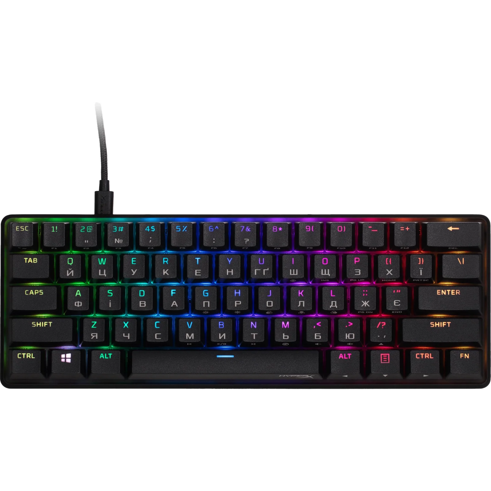 Ультракомпактный форм-фактор 60%, полностью алюминиевый корпус, механические переключатели HyperX Red, RGB-подсветка с динамическими эффектами, встроенная память на профили, игровой режим, 100% Anti-Ghosting, частота опроса 1000 Гц, трёхуровневая регулируемая высота клавиатуры, съёмный USB-C кабель, PBT колпачки с дополнительными функциями.