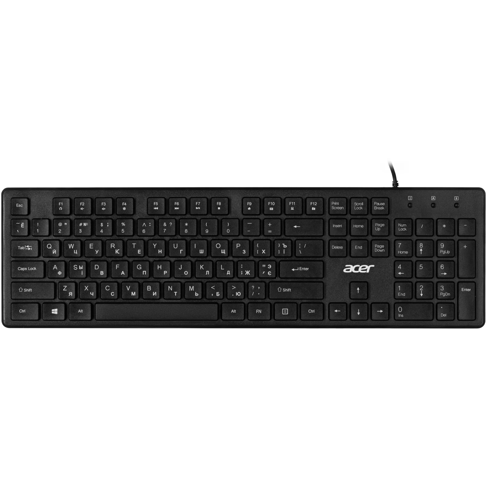 Acer OKW020 оснащена мембранными клавишами с ноутбучным профилем, что обеспечивает мягкий и тихий ход при наборе текста. Полноформатная раскладка включает цифровой блок и мультимедийные клавиши (FN + F1-F12), что делает работу с числами и медиа удобной и быстрой.