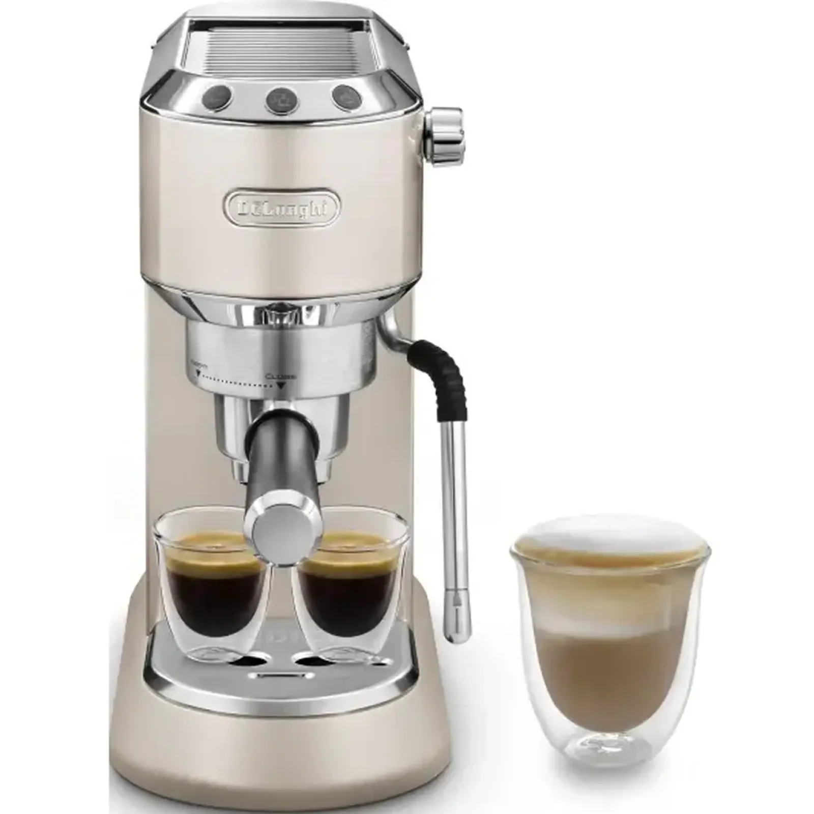 DeLonghi Dedica Arte EC 885.BG – компактная, стильная и одновременно мощная рожковая кофеварка, которая позволяет готовить кофе «как в кафе» прямо на вашей кухне. Ее корпус из нержавеющей стали с элегантной бежевой (Beige) отделкой легко впишется в любой интерьер, а узкая ширина – всего 15 см – делает ее идеальным решением для небольших кухонь или офисов.