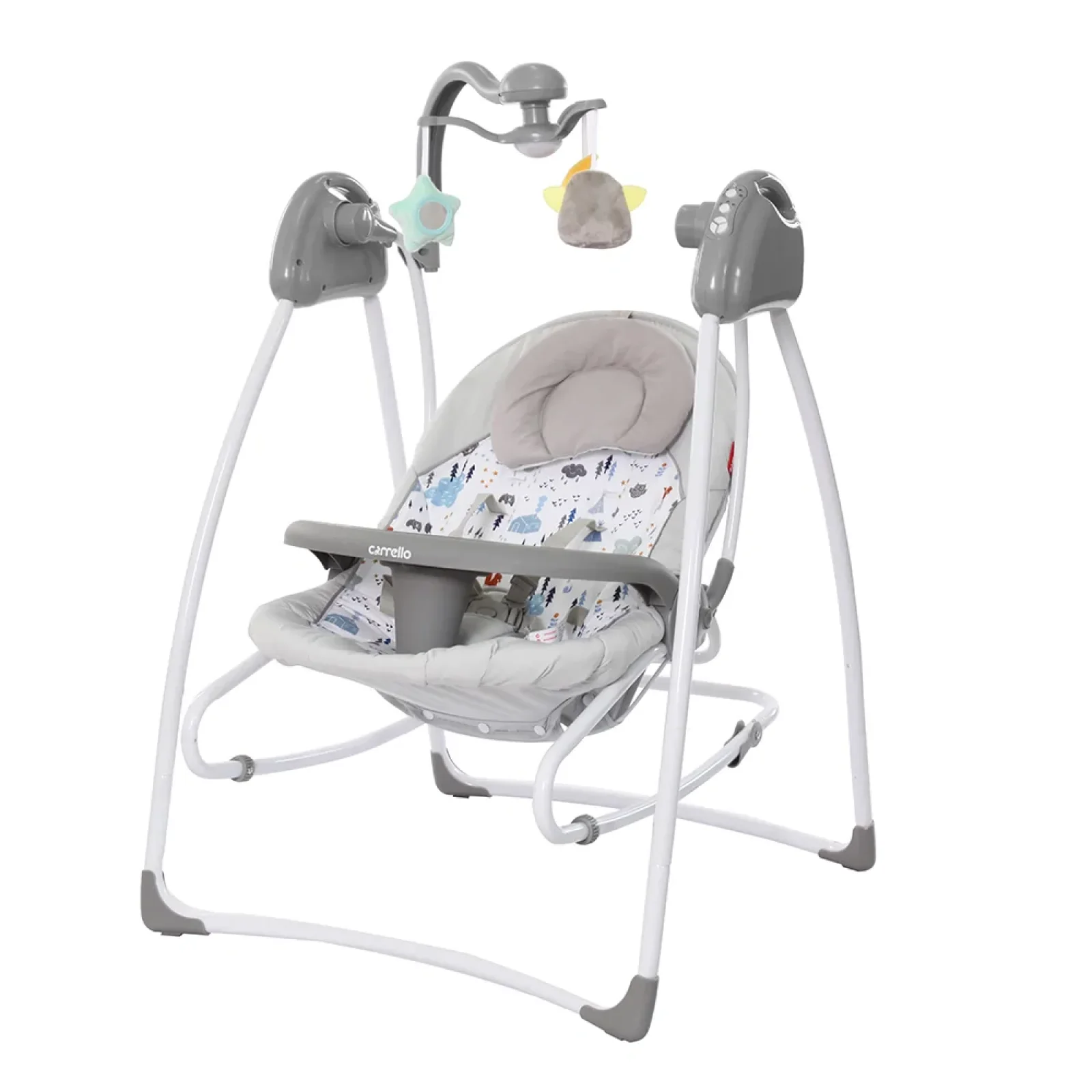 Електронна гойдалка 3 в1 для дітей від народження і до 15кг. Працюють від мережі або батарейок 4*С/LR14. Спинка регулюється в 3-х положеннях, є додаткова подушка під голову, столик з обмежувачем, музикальний мобіль. Сидіння можна зняти з рами і використовувати як крісло-гойдалку. В подарунковій упаковці. Розміри ящика - 49,5*14*71см