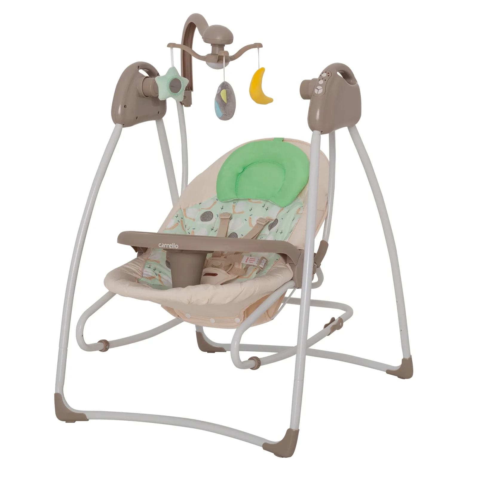 Електронна гойдалка 3 в1 для дітей від народження і до 15кг. Працюють від мережі або батарейок 4*С/LR14. Спинка регулюється в 3-х положеннях, є додаткова подушка під голову, столик з обмежувачем, музикальний мобіль. Сидіння можна зняти з рами і використовувати як крісло-гойдалку. В подарунковій упаковці. Розміри ящика - 49,5*14*71