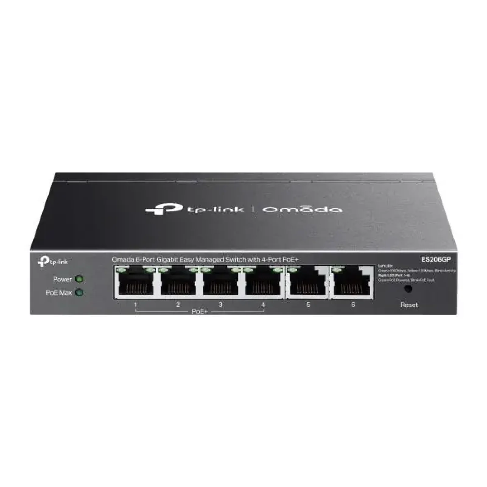 Порти PoE + 4 | Пропускна спроможність комутатора 12 Gbps | Пропускна здатність в пакетах 7.4 Mpps | Аксесуари в комплекті ES206GP, адаптер живлення, шнур живлення, гумові ніжки, посібник з встановлення | Розмір 158 × 101 × 25 мм | Вага без упаковки 0.5 кг