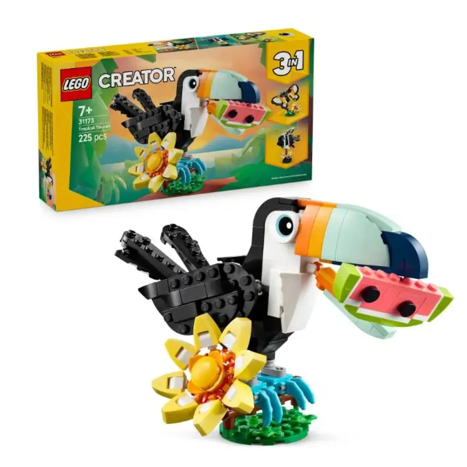 Насолоджуйтеся тропічними розвагами з цим чудовим конструктором LEGO® Creator 3-в-1 Дикі тварини: тропічний тукан (31173). Іграшкова пташка від LEGO сидить на гілці, вкритій великою квіткою з кубиків зі шматочком кавуна, а для додаткової цінності гри вона може рухати крилами, дзьобом і хвостом. У дітей є 3 різні варіанти складання наборів тварин LEGO з однакових кубиків: рухомий іграшковий тукан зі шматочком кавуна, який можна помістити в його дзьоб; барвистий іграшковий метелик із рухомими крильцями, що літає над ділянкою трави й підставкою для квітів; та іграшкова тропічна рибка з рухомими плавниками, яка може повертатися на 360 градусів на підставці із морським дном. Набори із серії LEGO Creator 3-в-1 надихають дітей на творчість із трьома різними моделями для конструювання в кожному наборі! Діти із захопленням створюватимуть, перетворюватимуть і знову створюватимуть. Набори 3-в-1 пропонують широкий асортимент, що відповідає найпалкішим дитячим захопленням, як-от надшвидкісні транспортні засоби, дивовижні тварини й будинки. Зверніть увагу, що моделі не можна створити одночасно. Набір містить 225 деталей.