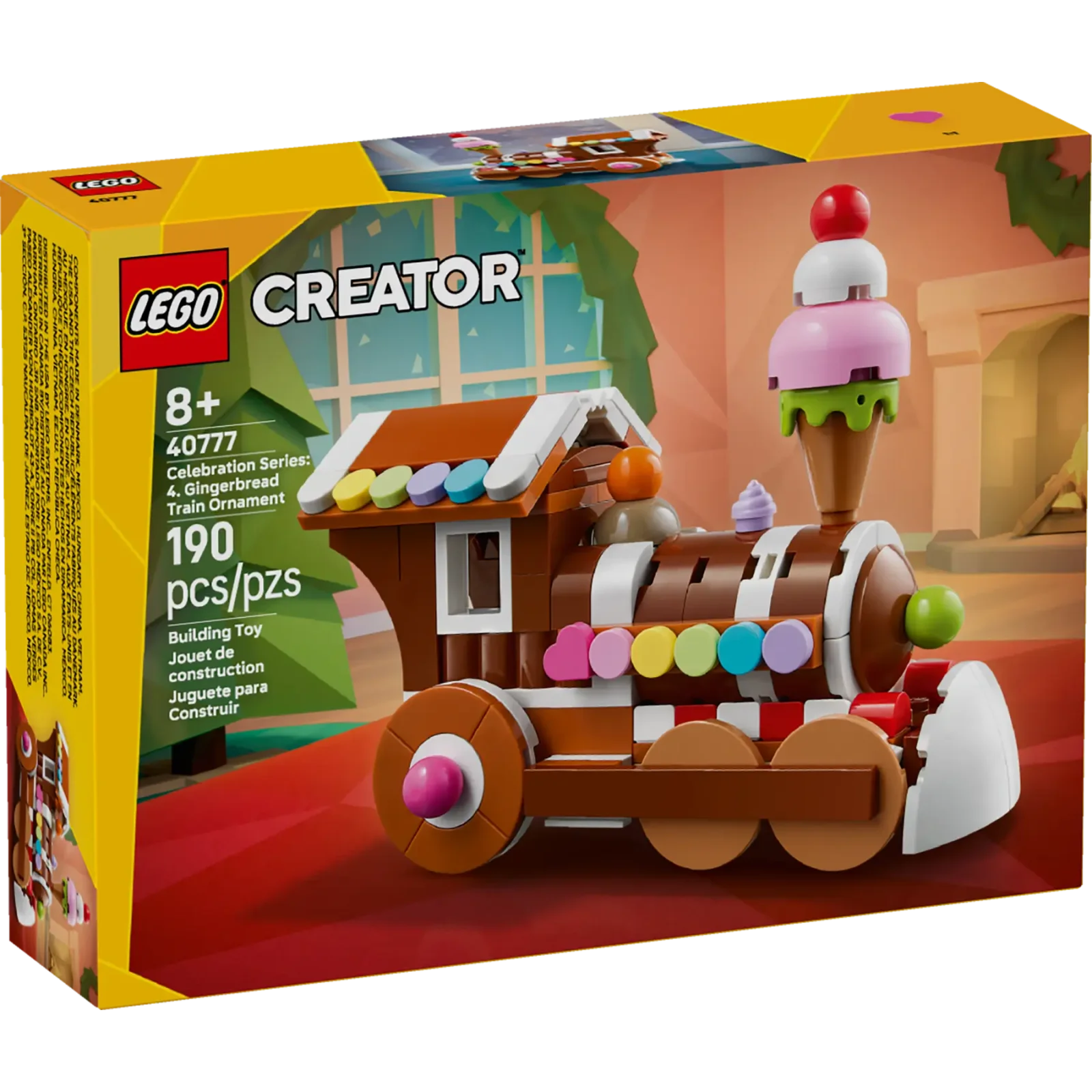 Отпразднуйте праздничный сезон с этим рождественским набором LEGO Creator Celebration Series: «Пряничный поезд» (40777). Пряничный поезд в стиле паровоза украшен глазурью и сладкими элементами, а спереди - рожок мороженого с вишенкой. Это отличный рождественский подарок, и дети от 8 лет и старше могут использовать игрушечный поезд с вращающимися колесами для разыгрывания забавных историй или в качестве рождественского украшения, чтобы добавить красок в любую комнату. Набор содержит 190 деталей.