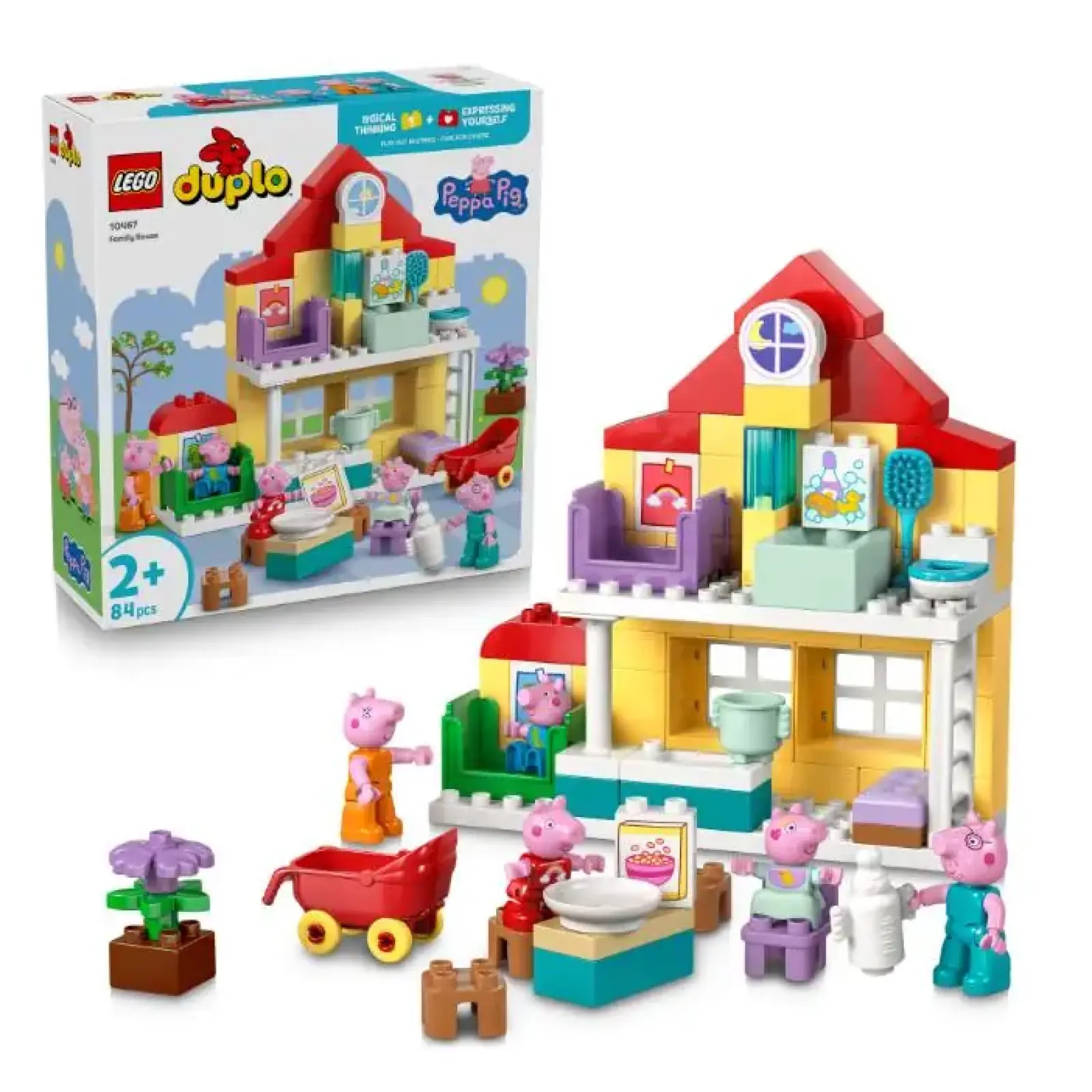 Конструктор LEGO DUPLO Peppa Pig «Сімейний будинок» (10467) — це затишний і деталізований набір для малюків від 2 років, який переносить у веселий світ улюбленої родини поросяток. Діти побудують двоповерховий рожевий будинок Пеппи з великою спальнію, кухнею, ванною, садом із гойдалкою та басейном — все з великих, яскравих блоків DUPLO, безпечних і зручних для крихітних ручок. У комплекті є фігурки Пеппи, Джорджа, Мами-Пеппи та Тата-Пеппи, а також аксесуари: ліжка, ванна з качками, кухонний стіл із їжею, іграшковий динозавр Джеральдін, велосипед, грязьова калюжа та багато іншого для рольової гри.