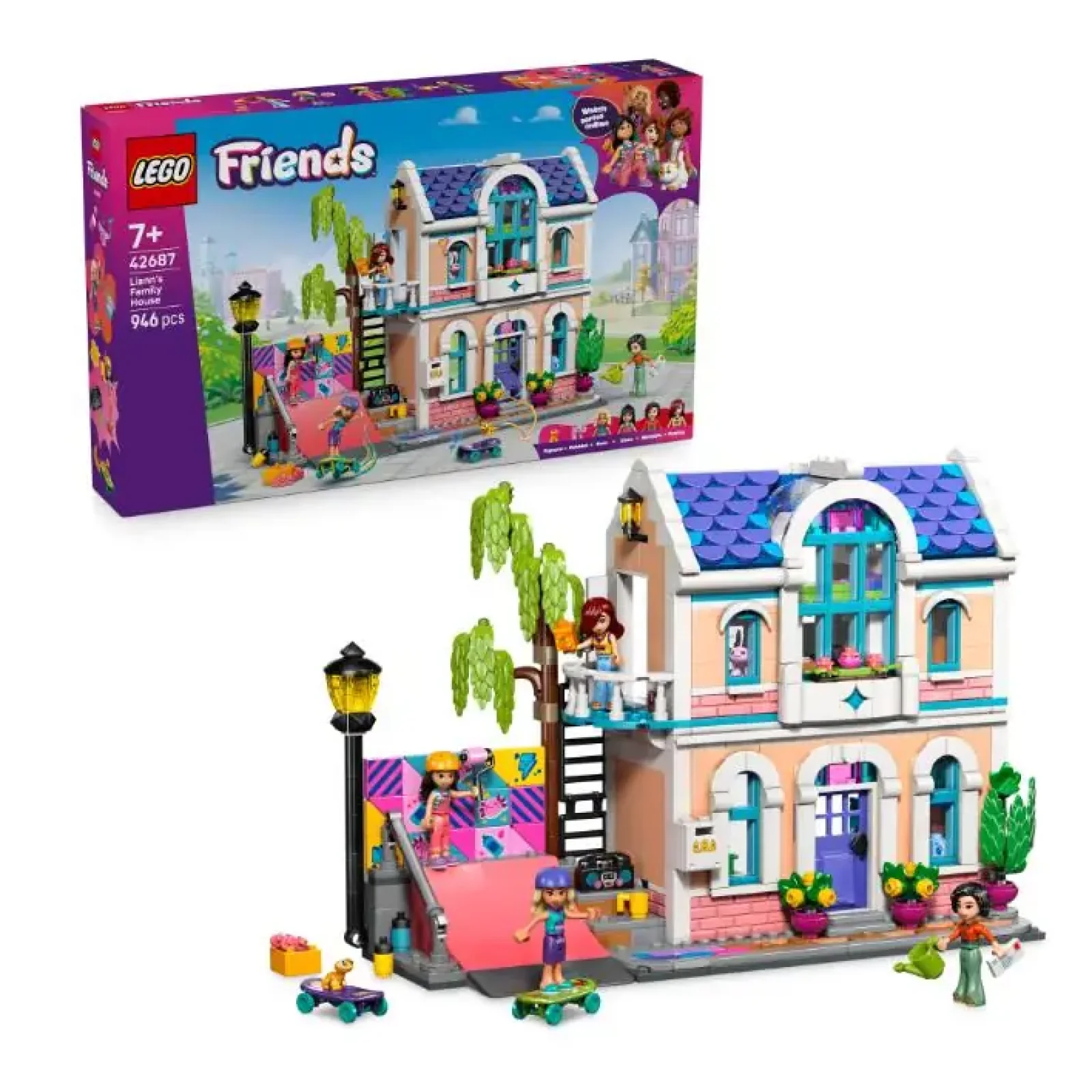 Ласкаво просимо до Родинного дому Ліан (42687), де діти від 7 років створюють власні історії. Дівчатка та хлопчики можуть досліджувати прекрасний іграшковий будиночок LEGO® з кухнею, вітальнею, спальнею, балконом і садом. Спробуйте різні хобі разом із Ліан та її друзями, які люблять кататися на скейтборді, займатися мистецтвом та доглядати за домашнім геконом і іграшковим аксолотлем. Детальна іграшка для сюжетних ігор містить 4 мініляльки та безліч аксесуарів. Відкрийте для себе скейтборди, художнє приладдя, бумбокс, письмовий стіл, тераріуми й багато іншого. Є також милі аксесуари для їжі, як-от палички, коробки для локшини, соєвий соус, молоко та апельсиновий сік. Діти можуть навіть випробувати свої дизайнерські здібності, використовуючи знімні плитки для персоналізації барвистої фрески. Цей набір стане креативним подарунком для дівчаток і хлопчиків, які люблять грати з будинками. За допомогою додатка LEGO Builder діти можуть насолоджуватися інтуїтивно зрозумілим процесом конструювання, де вони можуть збільшувати та обертати набори за допомогою 3D-інструкцій, зберігати набори та відстежувати прогрес. Набір містить 946 деталей.
