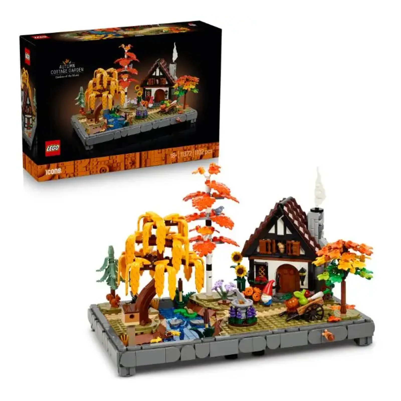Відтворіть красу осені з набором для дорослих LEGO® Icons «Осінній котеджний сад» (11372). Створіть сезонну композицію, сповнену осінніх кольорів. Пориньте у розслаблене заняття, створюючи кожну складну деталь, а потім переставте дерева, рослини та елементи декору в стилі «коттеджкор», щоб створити яскраву композицію для дому або офісу. Натхнене казковими котеджами, це доповнення до колекції «Сади світу» «засаджене» березами, плакучими вербами, блакитними ялинами та кленами, а також сезонними квітами. Серед інших цікавих елементів — сонячний годинник, шпаківня, візок для овочів, садовий гном та струмок із камінцями. Котедж із затишною кухнею та лісовими тваринами, серед яких дрізд, дятел, білка, жаба й равлик, додають останні штрихи до цієї моделі — ідеального подарунка для дорослих шанувальників творчого декору для дому. Будуйте з розумом завдяки додатку LEGO® Builder: збільшуйте, обертайте в 3D, відстежуйте свій прогрес і дотримуйтесь покрокових цифрових інструкцій. Набір містить 1102 деталі.
