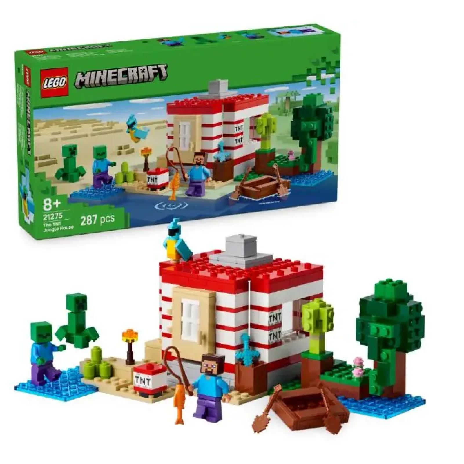 Подаруйте гравцям і шанувальникам Minecraft® вибухову втіху завдяки веселій і творчій іграшці. Будинок з вибухівки в джунглях (21275) — це універсальний геймерський подарунок для дітей віком від 8 років, які захоплюються пригодницькими іграшками, декором із відеоігор і пригодами Minecraft. Події в будиночку розгортаються в біомі джунглів Minecraft і виглядають як масштабна версія культового динаміту гри. Перемикач збоку дозволяє дітям активувати функцію вибуху, яка руйнує весь будинок. Коли пил осяде, будівлю можна перебувати, щоб підготувати до наступної пригоди. Мініфігурки Стіва, Кріпера й зомбі надихають на творчу гру й бойові дії. Серед автентичних аксесуарів LEGO Minecraft є човен, вудка, риба, папуга й листя джунглів. Додаток LEGO® Builder дарує дітям додаткове задоволення від використання пристрою для масштабування та обертання моделей у 3D. Набір містить 287 елементів.