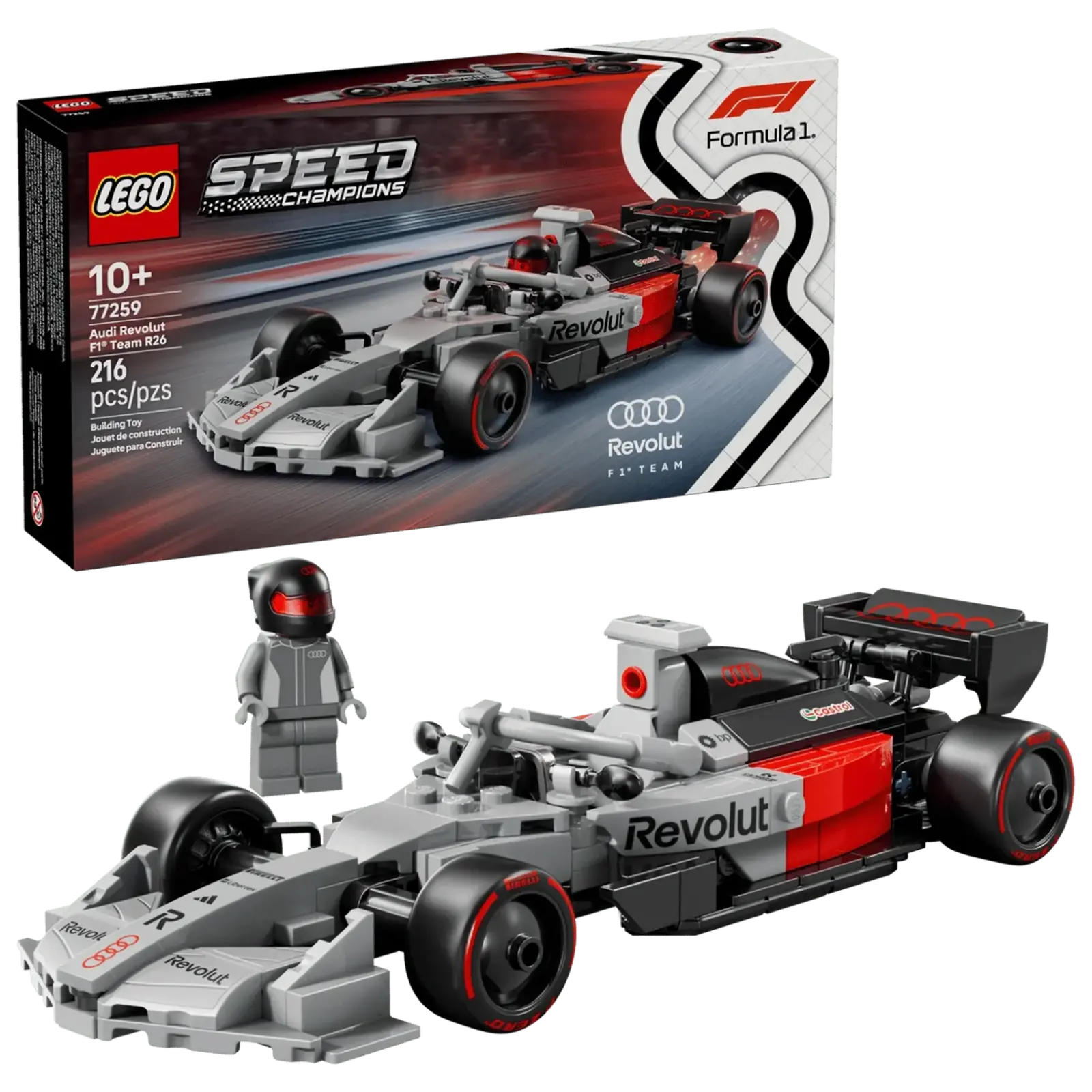 Ребята в возрасте от 10 лет могут коллекционировать, собирать, демонстрировать и участвовать в гонках на этом гоночном автомобиле LEGO® Speed Champions Audi Revolut F1® Team R26 (77259).