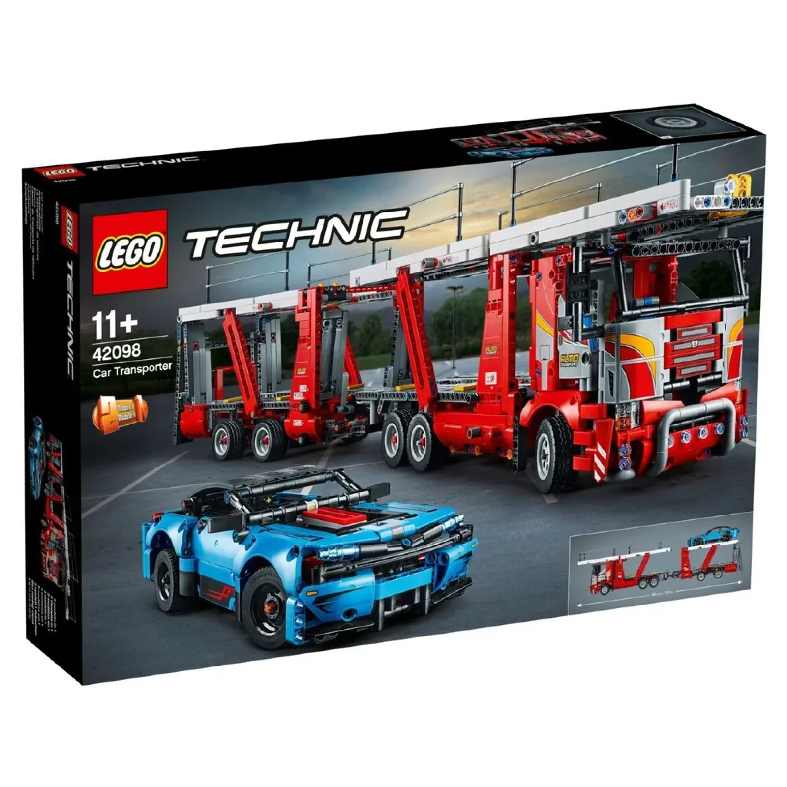LEGO Technic Car Transporter (42098) — гігантський транспортний шедевр для фанатів логістики та механіки! Цей масивний набір з 2493 елементів відтворює повнорозмірний автопоїзд: 5-осьову вантажівку-кабінну з кабіною водія та напівпричіп з рампою для 2 позашляховиків. Довжина моделі — 116 см — справжній монстр на столі!