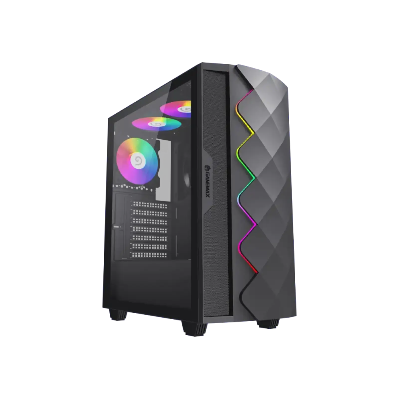 Корпус Black Diamond выделяется уникальной передней панелью с трехмерным геометрическим узором, напоминающим грани бриллианта. Встроенная ARGB-лента проходит через всю панель, создавая динамичные световые эффекты, которые подчеркивают современный игровой стиль системы и делают ее центральным элементом интерьера.