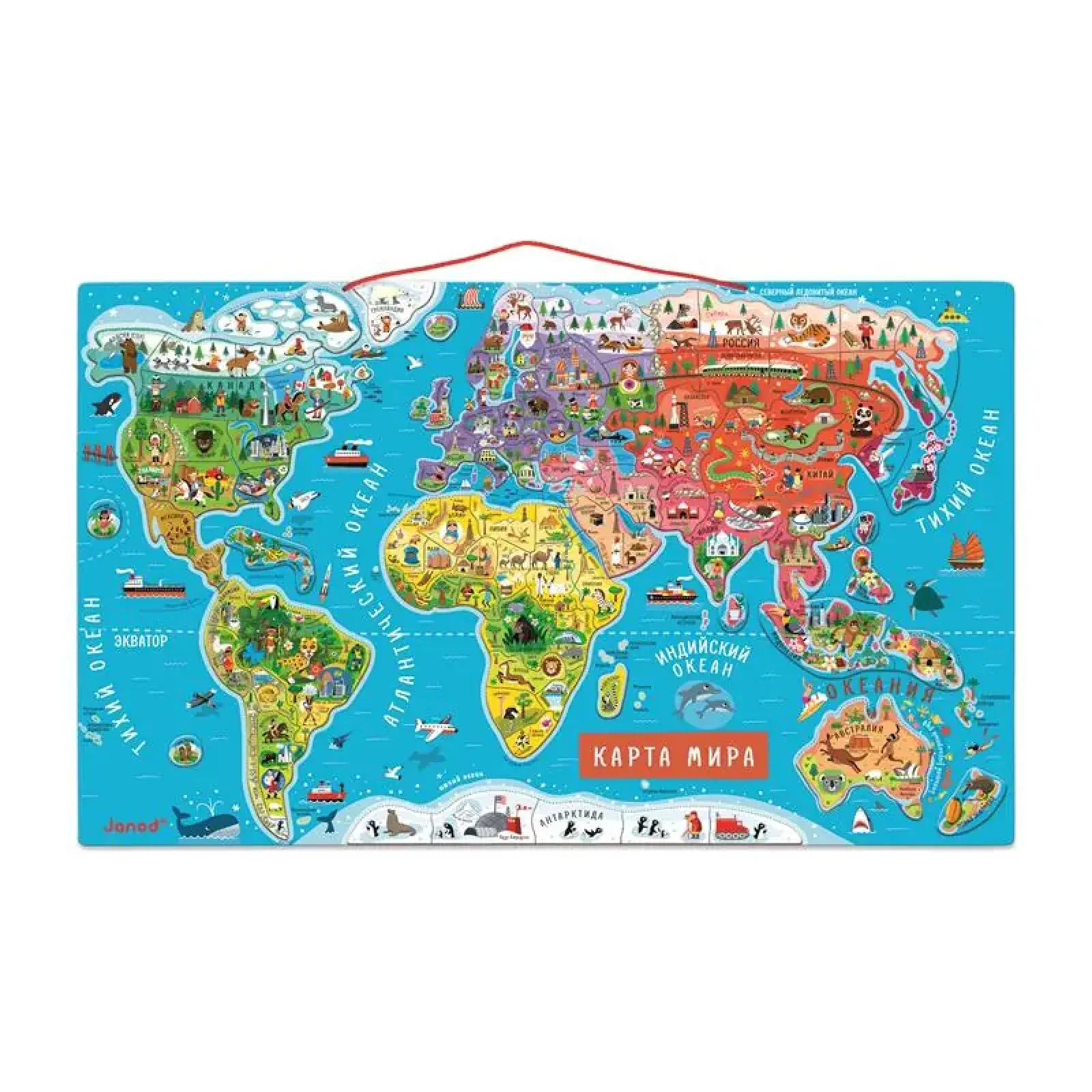 Досліджувати світ весело та цікаво, особливо разом з французьким брендом Janod. На величезній мапі світу зображені усі континенти та океани із межами та назвами. Також у набір входить 92 магніти із написами та малюнками, які необхідно розставити відповідно до регіону. Зібравши повну мапу дитина дізнається про особливості країни або регіону, її назву, які тварини там проживають або які там є пам’ятки архітектури. Розмір мапи: 77 х 1 х 46 см. Її можна підвісити на стіні для зручності. Рекомендований вік: 3+