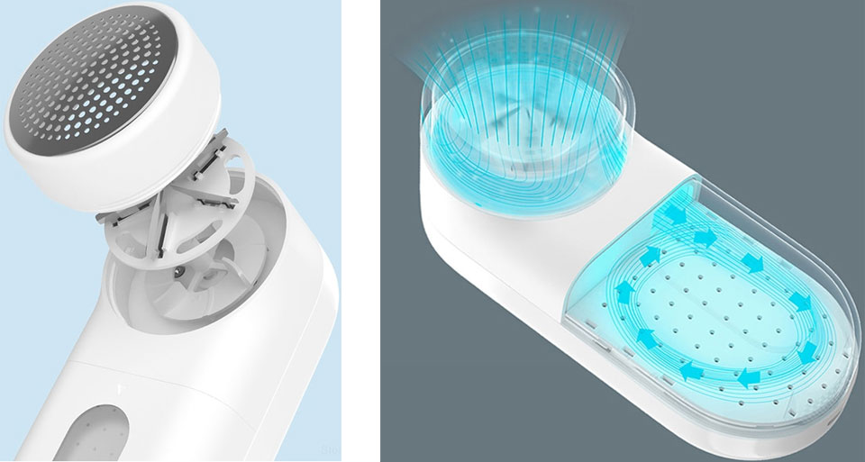 Новая конструкции лопасти центробежного вентилятора отрицательного давления позволяет легко втягивать срезанные катышки. П-образная конструкция воздуховода с защитой от обратного потока предотвращает обратный поток шариков из ворса.