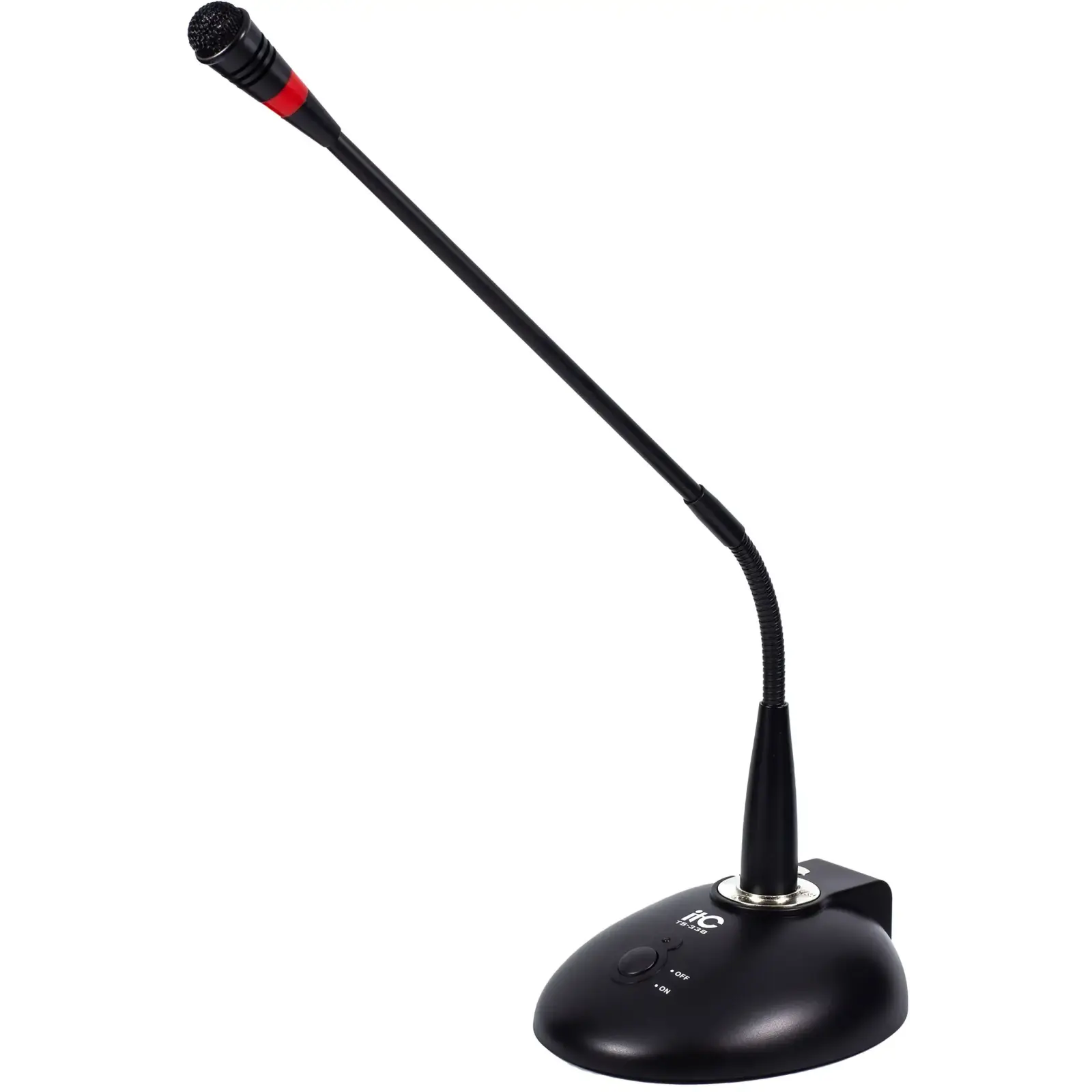Настільний мікрофон ITC TS-338 призначений для подачі мовних оголошень. Включення / відключення мікрофона здійснюється кнопкою, розташованої на передній частині корпусу підставки. При включенні мікрофона спалахує індикатор, розміщений над кнопкою включення.