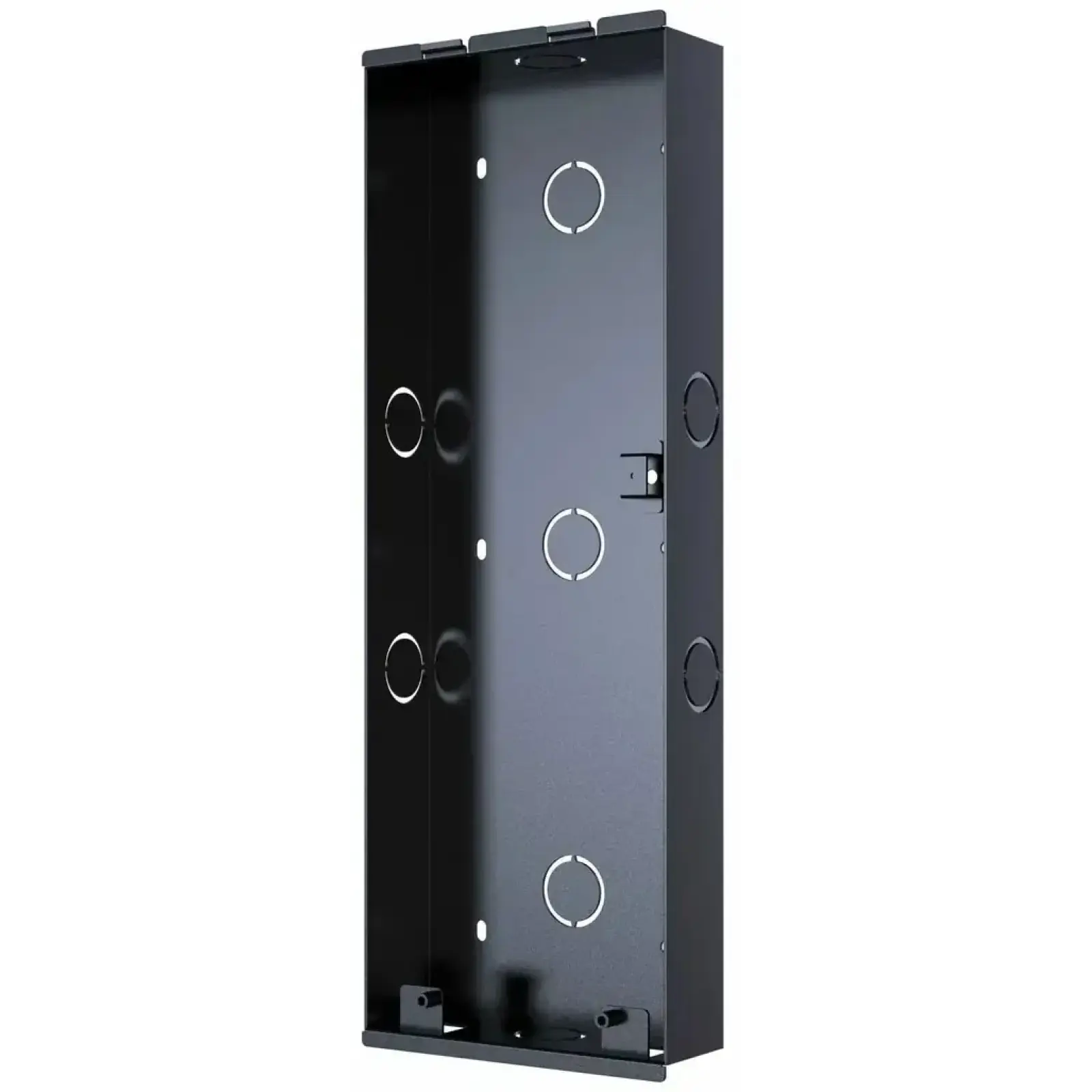 Стриманий чорний колір і лаконічний дизайн дозволяють монтажній коробці гармонійно поєднуватися з панелями Akuvox та органічно вписуватися в будь-який тип екстер’єру — житловий або комерційний.