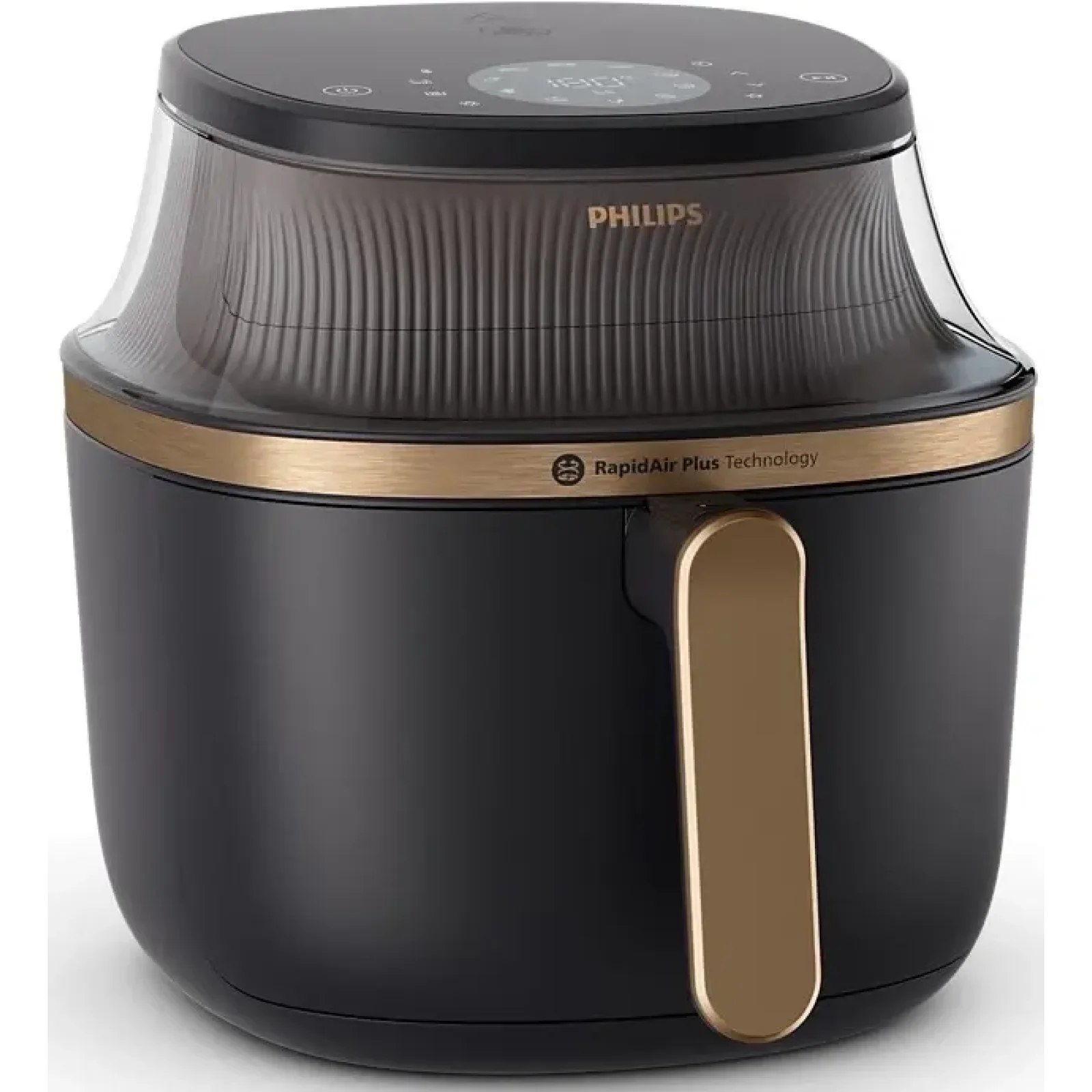 Запатентована технологія Rapid Air Plus з унікальною «зіркоподібною» конструкцією дна проганяє гаряче повітря навколо та крізь продукти, забезпечуючи рівномірне пропікання з усіх боків. Страви стають хрусткими без фритюрної олії, а зайвий жир стікає в піддон — до 40–90% менше жиру в порівнянні з традиційним смаженням.