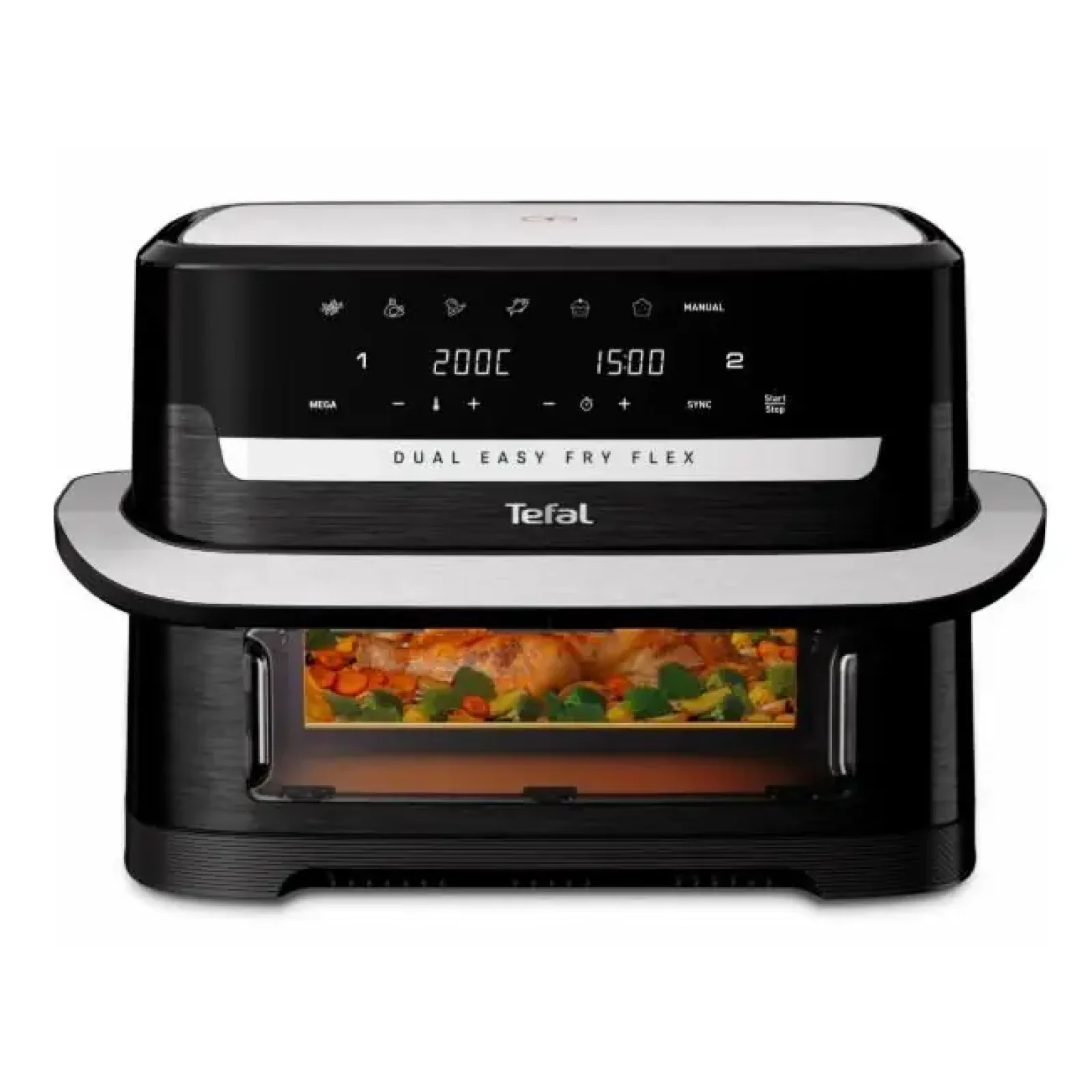 Відкрийте для себе мультипіч Tefal Dual Easy Fry Flex EY9228E0 - ідеальне поєднання універсальності та місткості. Завдяки знімному роздільнику FlexCook ви можете легко перемикатися з двох незалежних зон приготування (5,5 л + 3,5 л) на одну велику GiantZone об’ємом 9 л. Це дозволяє готувати як щедрі порції для всієї родини, так і різні страви одночасно з індивідуальними налаштуваннями часу та температури.