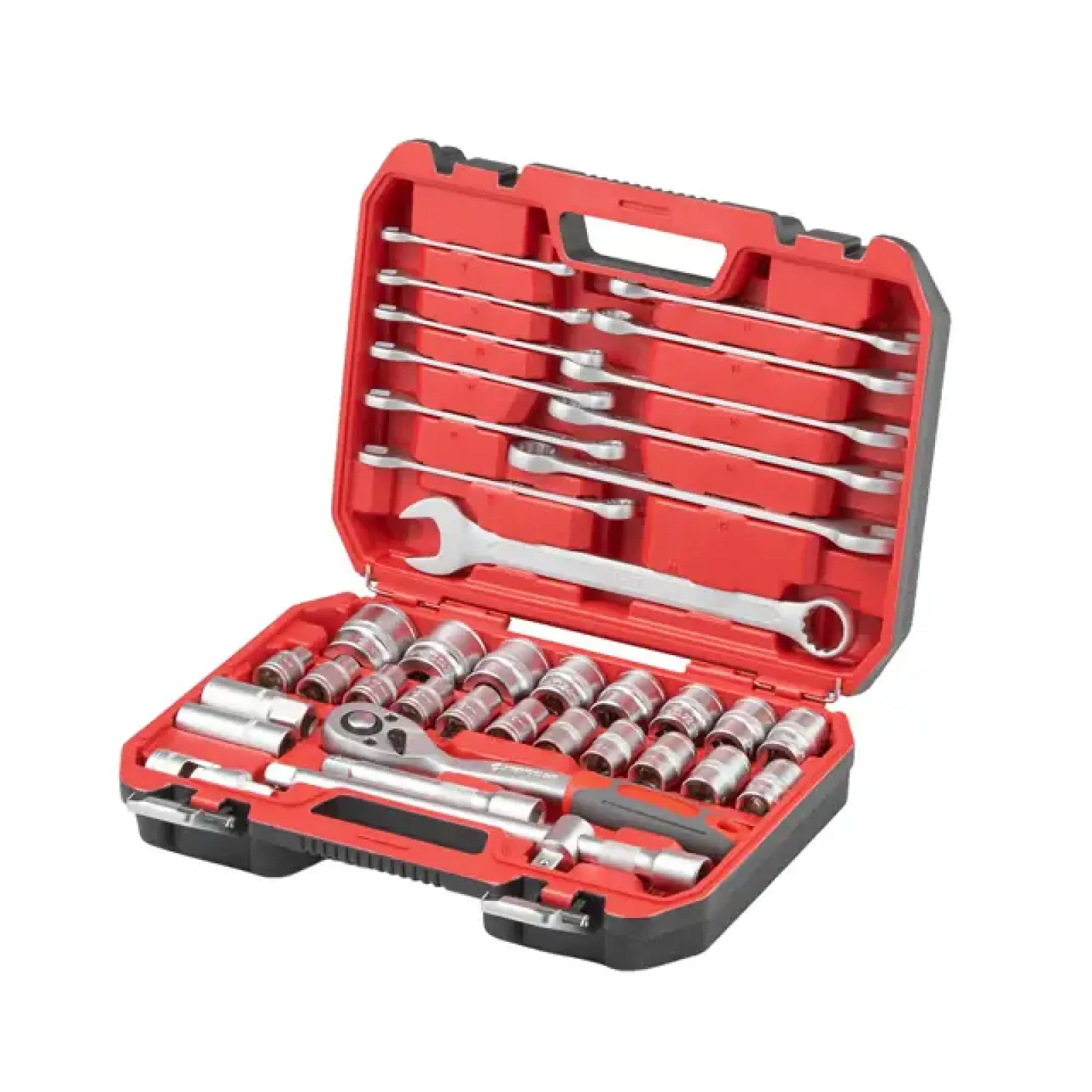 Набір з комплектацією на 38 одиниць включає тріскачку з посадковим квадратом 1/2", набір шестигранних головок від 8 до 32 мм, вони підходять для виконання різнопланових робіт на закручування та відкручування кріплень.