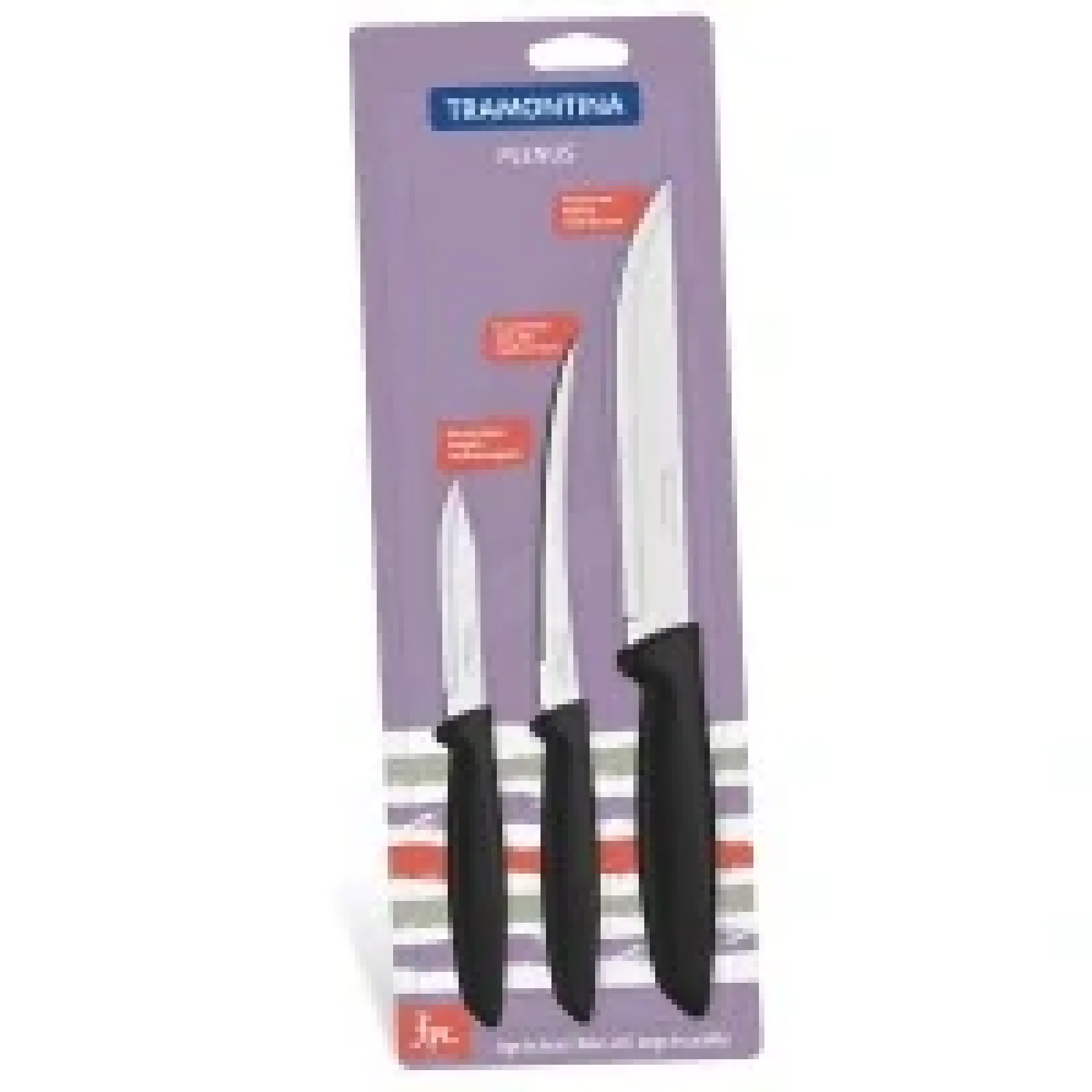 Набор ножей Tramontina Plenus black, 3 предмета (23498/013) Комплектация: Нож для томатов 1 шт-127 мм. Нож для овощей 1 шт-76 мм. Нож для мяса 1 шт-152 мм Материал лезвия: нержавеющая сталь AISI 420. Материал рукоятки: полипропилен. Режущая кромка ножа: гладкая\зубчатая. Упаковка: индивидуальный блистер.