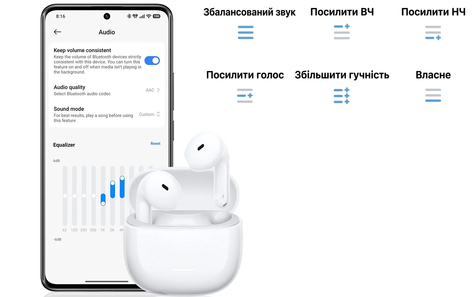 В Redmi Buds 8 Active предусмотрено пять предустановленных режимов EQ – Balanced sound, Enhance treble, Enhance bass, Enhance voice и Boost volume. Дополнительно доступно индивидуальное настройка кривой эквалайзера, чтобы точнее отрегулировать высокие, средние и низкие частоты под собственный вкус. Такой подход делает модель универсальнее – наушники легко адаптируются как к музыке разных жанров, так и к голосовому контенту или повседневным звонкам.