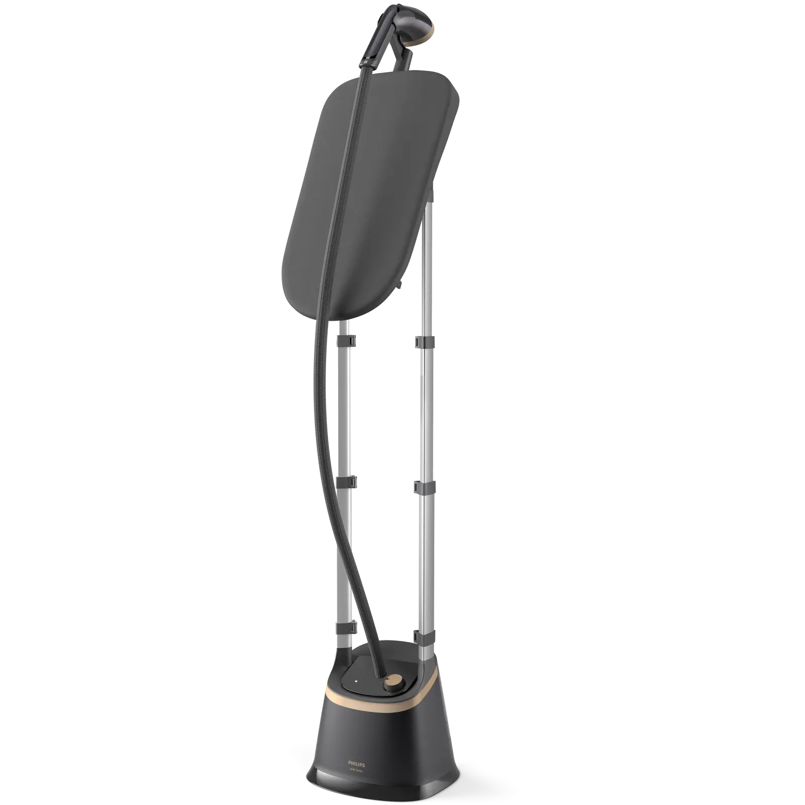 Устройство оснащено интегрированной доской StyleBoard, которая обеспечивает надёжную опору при обработке ткани и позволяет эффективно отпаривать большие участки одежды сверху вниз. Наклонная доска делает работу ещё удобнее, а крупная металлическая насадка с острым носиком позволяет точно обрабатывать труднодоступные зоны — воротники, манжеты и участки возле пуговиц. Система предлагает три режима подачи пара, что позволяет адаптировать интенсивность обработки под разные типы тканей — от тонких деликатных материалов до плотной верхней одежды.