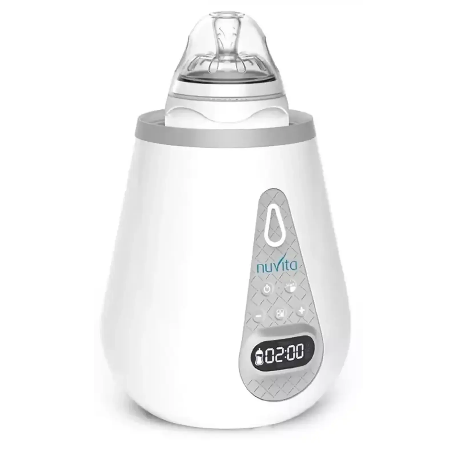 Цифровий електричний підігрівач-стерилізатор для пляшечок Nuvita NV1170 має світлодіодний екран і кнопки для вибору функцій: