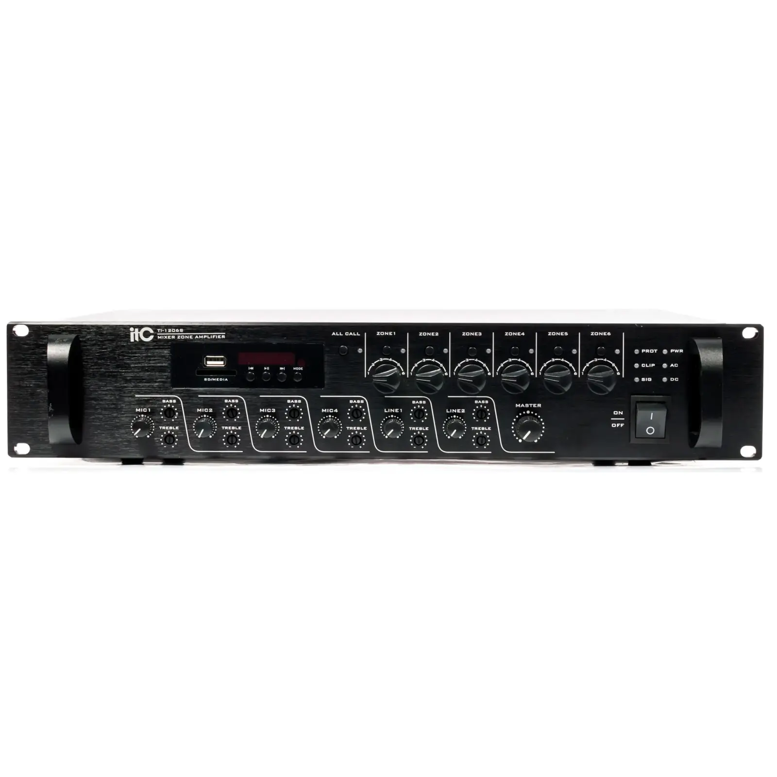 Мікшуючий багатозонний підсилювач потужності з вбудованим плеєром для відтворення файлів з USB накопичувача або SD карти, FM тюнер і функція Bluetooth. Ідеальне рішення для трансляції фонової музики і повідомлень на об'єктах з декількома приміщеннями або зонами трансляції де потрібно роздільне регулювання гучності, таких як торгові і розважальні центри, готелі, офіси, школи і ВНЗ, магазини і супермаркети, ресторани, ландшафтні парки і т.д.