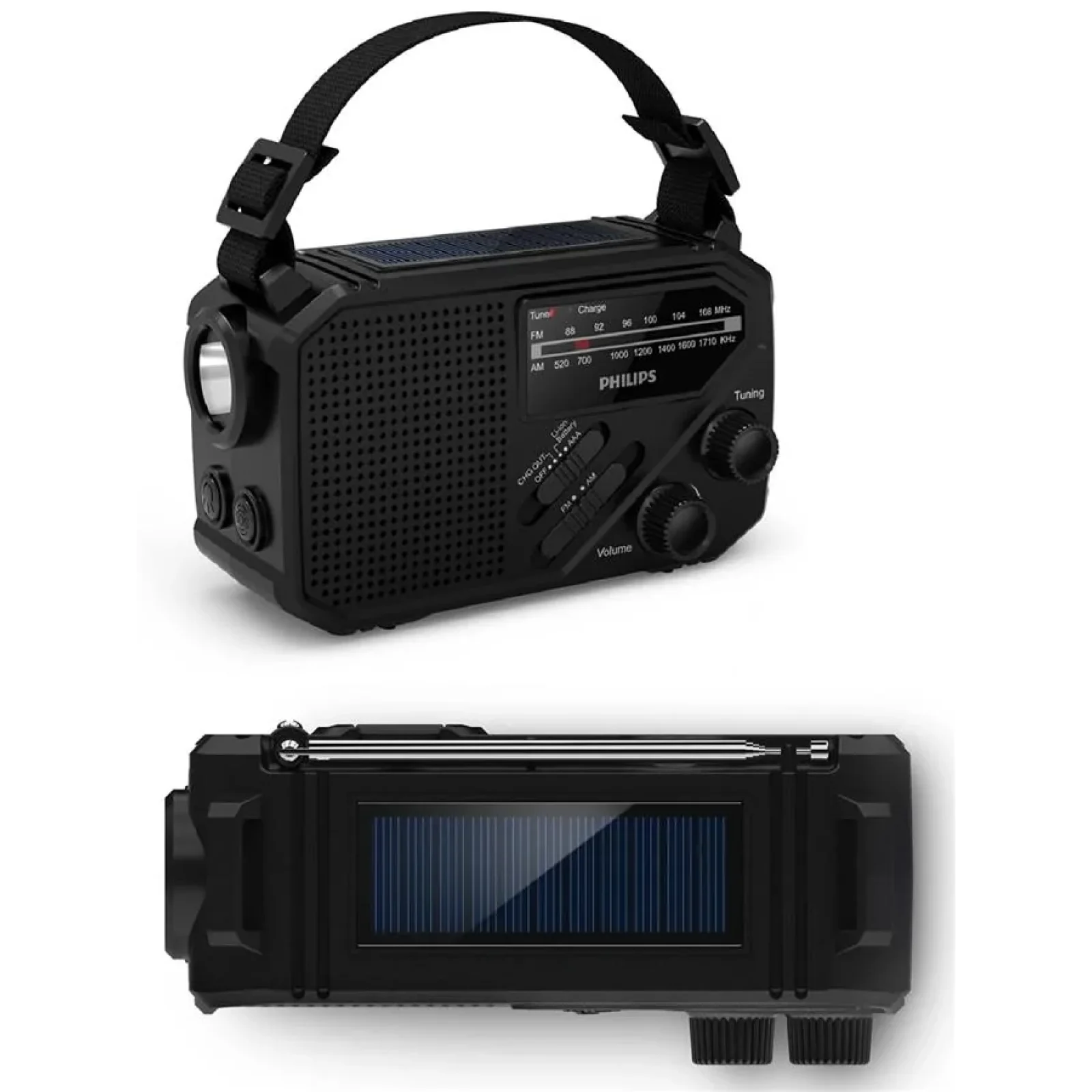 Ніколи не втрачайте заряд! Резервне заряджання завжди доступне через сонячні панелі у верхній частині радіоприймача або за допомогою ручної рукоятки. Радіоприймач також працює від 3 батарейок ААА (не входять в комплект). Порт USB-A дозволяє використовувати радіоприймач для заряджання інших пристроїв у екстреній ситуації.