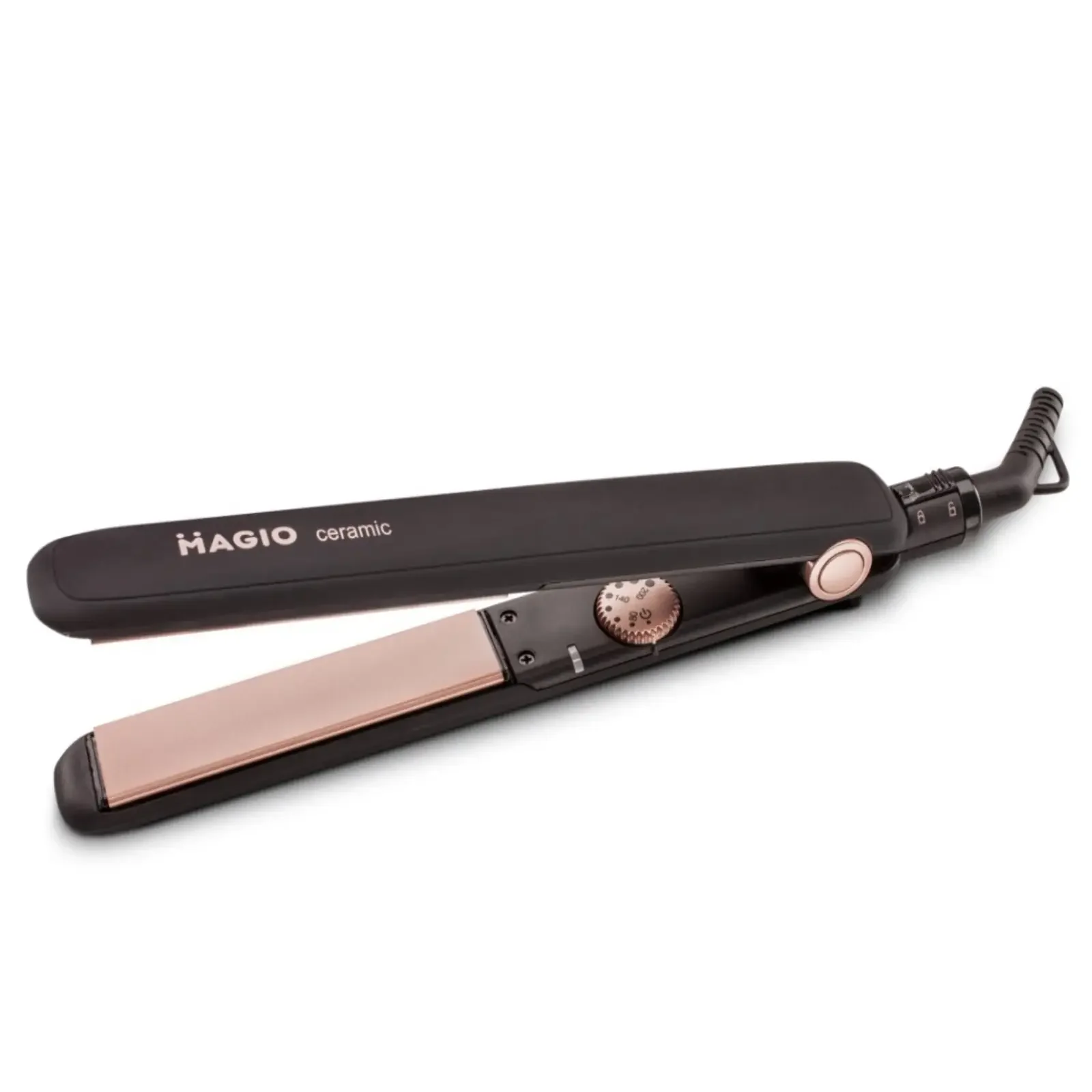 Щипці для волосся MG-577 від Magio потужністю 45 Вт мають керамічне покриття нагрівальної поверхні, оснащені функцією блокування ручки та для зручності використання виконані з петлею для підвішування.