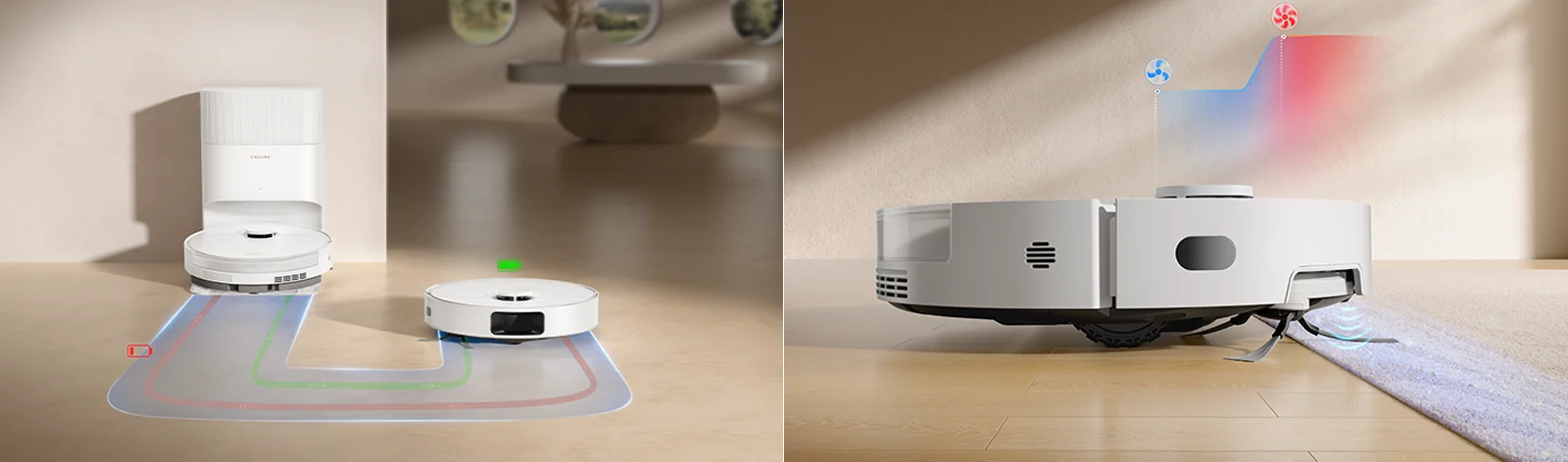 Сила всасывания достигает 13 000 Па, а четыре режима мощности (Quiet, Standard, Strong, Turbo) позволяют оптимизировать работу под различные типы загрязнений и покрытий. Кроме того, есть функция Carpet Boost: на коврах пылесос автоматически повышает мощность всасывания для глубокого очищения.