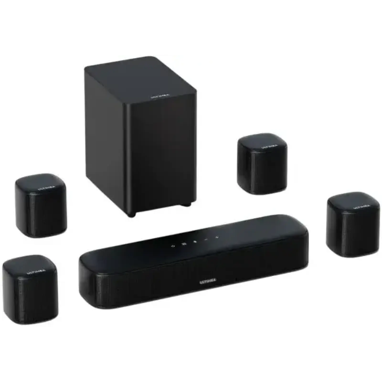 У комплекті з основною звуковою панеллю ви отримаєте чотири колонки-сателіти, сабвуфер, пульти дистанційного керування та монтажні кронштейни, що дозволяють легко інтегрувати систему в інтер’єр і налаштувати оптимальне розміщення для об’ємного звучання.