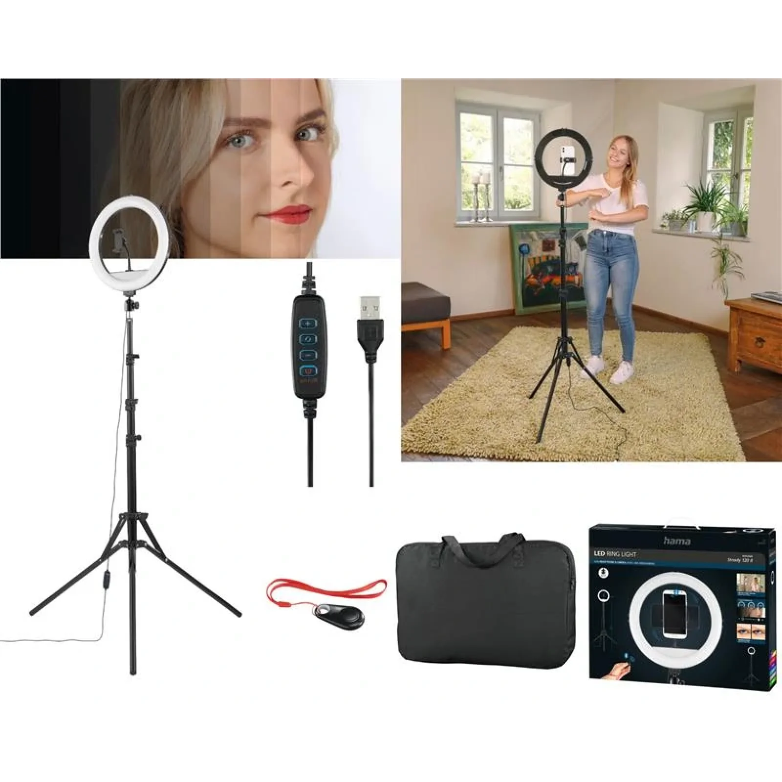 Незаменимый аксессуар для блоггеров, фотографов, визажистов. Hama SpotLight Smart 120 станет отличным помощником для съемки фото/видео, позволяя создавать контент на профессиональном уровне. Мощная кольцевая лампа с разными оттенками свечения обеспечивает равномерное освещение, а пульт позволяет легко управлять подсветкой, регулировать яркость и цвет. А также, Bluetooth пульт который позволит проводить съемки фото или видео на расстоянии до 10 м.