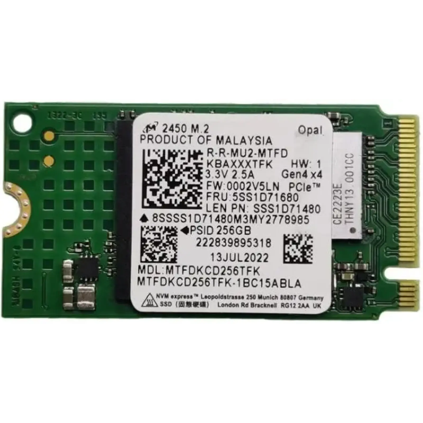 Micron MTFDKCD256TFK — це компактний NVMe SSD ємністю 256 ГБ у форм-факторі M.2 2242 (22×42 мм), побудований на 176-шаровій 3D NAND TLC з інтерфейсом PCIe Gen4 x4 для максимальної швидкості в ультратонких ноутбуках і вбудованих системах. Він ідеально підходить для апгрейду Chromebook, міні-ПК чи планшетів, де кожен міліметр на рахунку, забезпечуючи блискавичний запуск ОС і застосунків без компромісів по продуктивності.