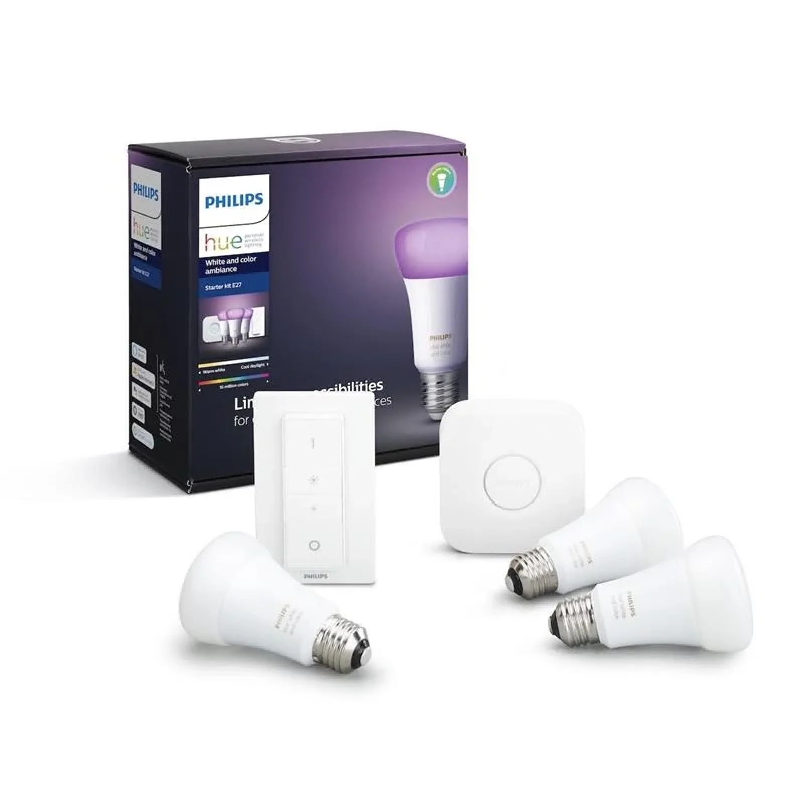 Организуйте умное освещение в доме со стартовым комплектом Philips Hue, в составе которого есть три умные лампы с цоколем E27 на 16 миллионов оттенков цветов, блок управления Philips Hue Bridge и пульт дистанционного управления Philips Hue Dimmer. Этого комплекта достаточно для начала работы с умным домашним освещением Philips Hue и изучения его увлекательных возможностей.