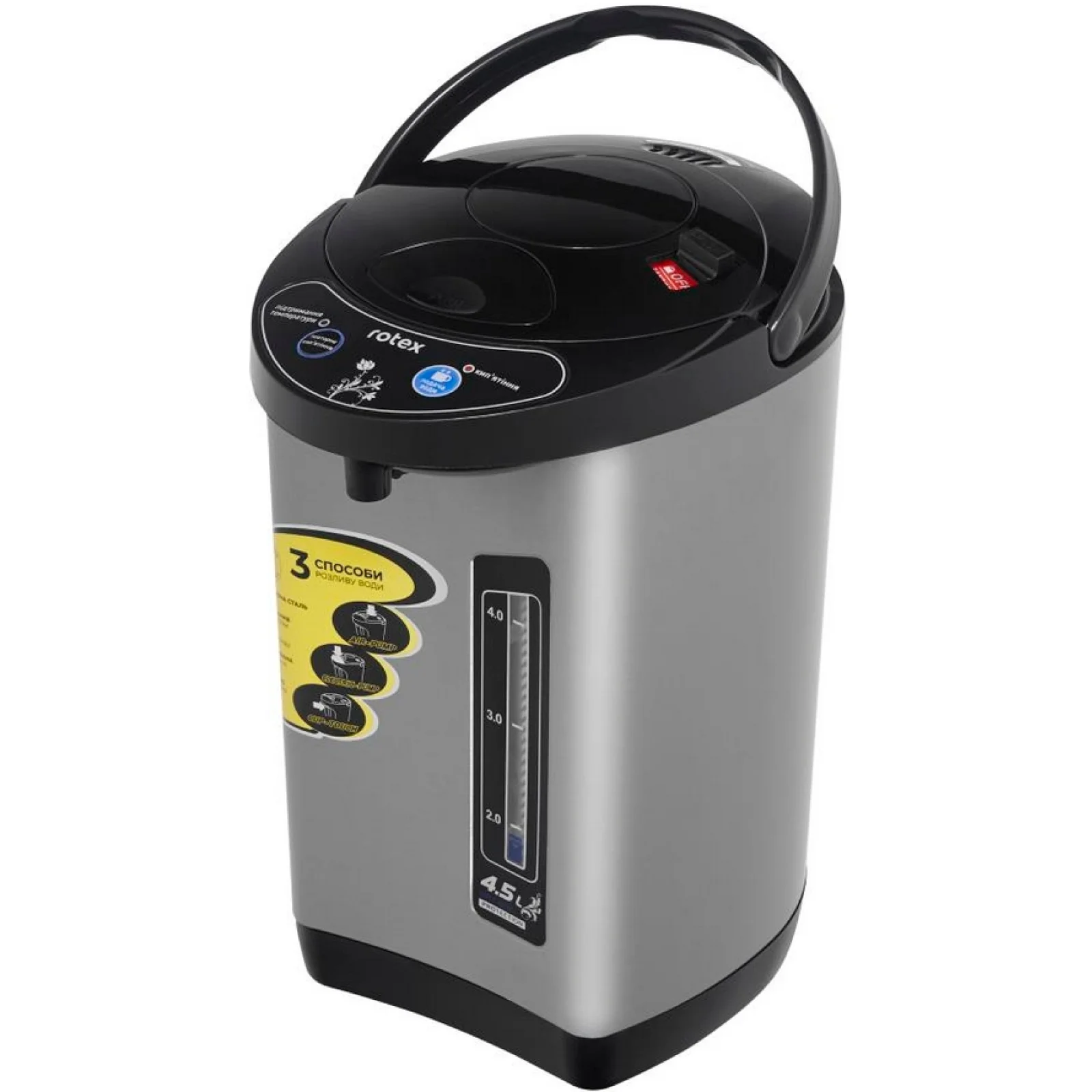 Об'ем 4,5 л. Потужність 800 Вт.ТЕРМОПОТ. Живлення - 220-240В, 50Гц, Прихований нагрівальний елемент з нержавіючої сталі. Колба з високоякісної нержавіючої сталі (сталь 304). Автоматичне відключення при закипання. Блокування помпи подачі води на кришці. 3 СПОСОБУ РОЗЛИВУ ВОДИ: автоматичний, механічний, прямий (натискання клавіші чашкою за носиком подачі води).Підтримання температури води. Повторне кип'ятіння. Індикатор кип'ятіння. Індикатор підтримки температури. Захист від перегріву. Захист від протікання. Матеріал корпусу: нержавіюча сталь. Колір: нержавіюча сталь.