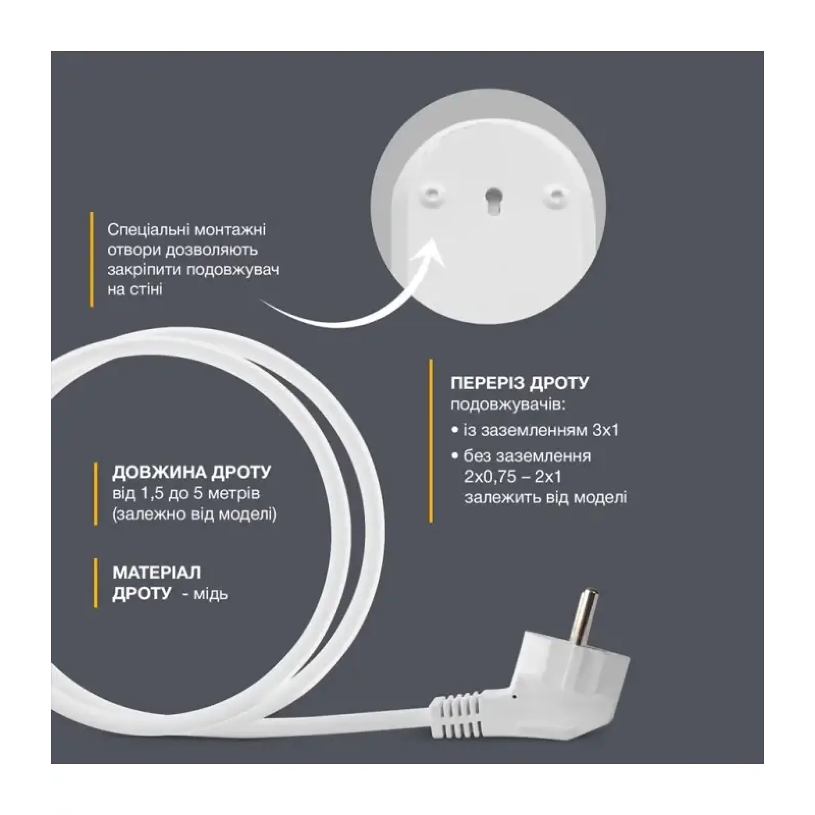 Довжина дроту 3м. У подовжувачі забезпечено захист "від дітей" струмо ведучих елементів шторками та будований фільтр - від перешкод в мережі. Провід багатожильний мідний, перетин 3х1мм.