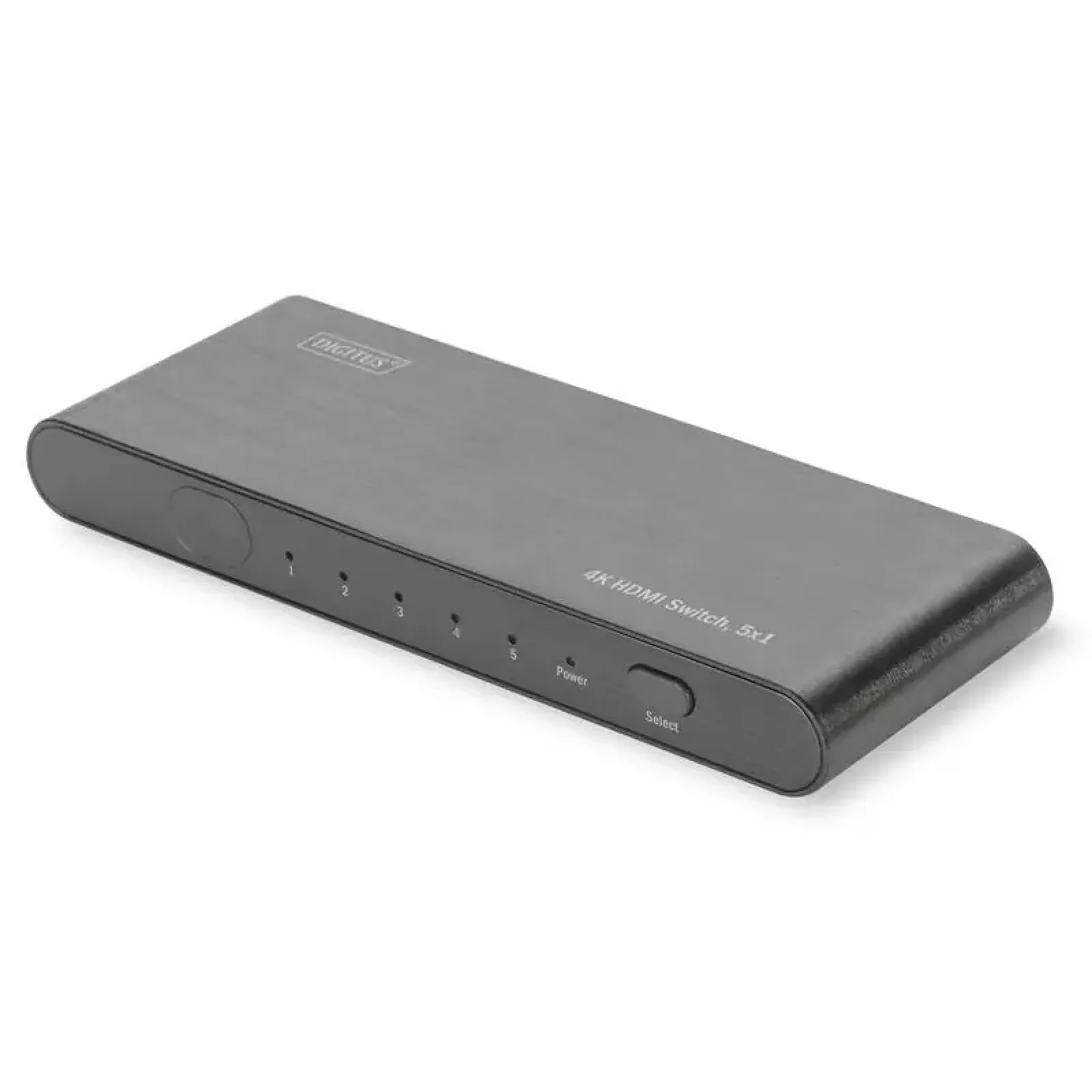 Комутаційний перемикач Digitus 4K HDMI 5x1 дає змогу здійснювати зручне перемикання 5 вхідних джерел HDMI (плеєр DVD/Blu-ray, ігрова приставка, пристрій відтворення/медіаплеєр, цифровий ресивер тощо) за допомогою дистанційного керування, за допомогою інтелектуального автоматичного розпізнавання або, як альтернатива, за допомогою перемикача на комутаторі.