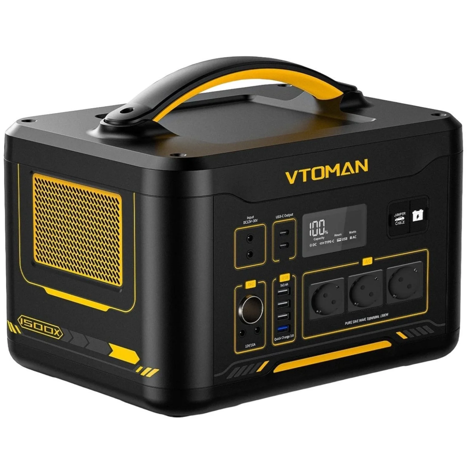 Потужність і сумісність: Vtoman Jump 1500X може похвалитися надвисокою вихідною потужністю 1500 Вт і унікальною технологією V-beyond, сумісною з приладами та пристроями, такими як електронні плити, мікрохвильові печі, кондиціонер і холодильники. Загальна миттєва потужність становить 3000 Вт.