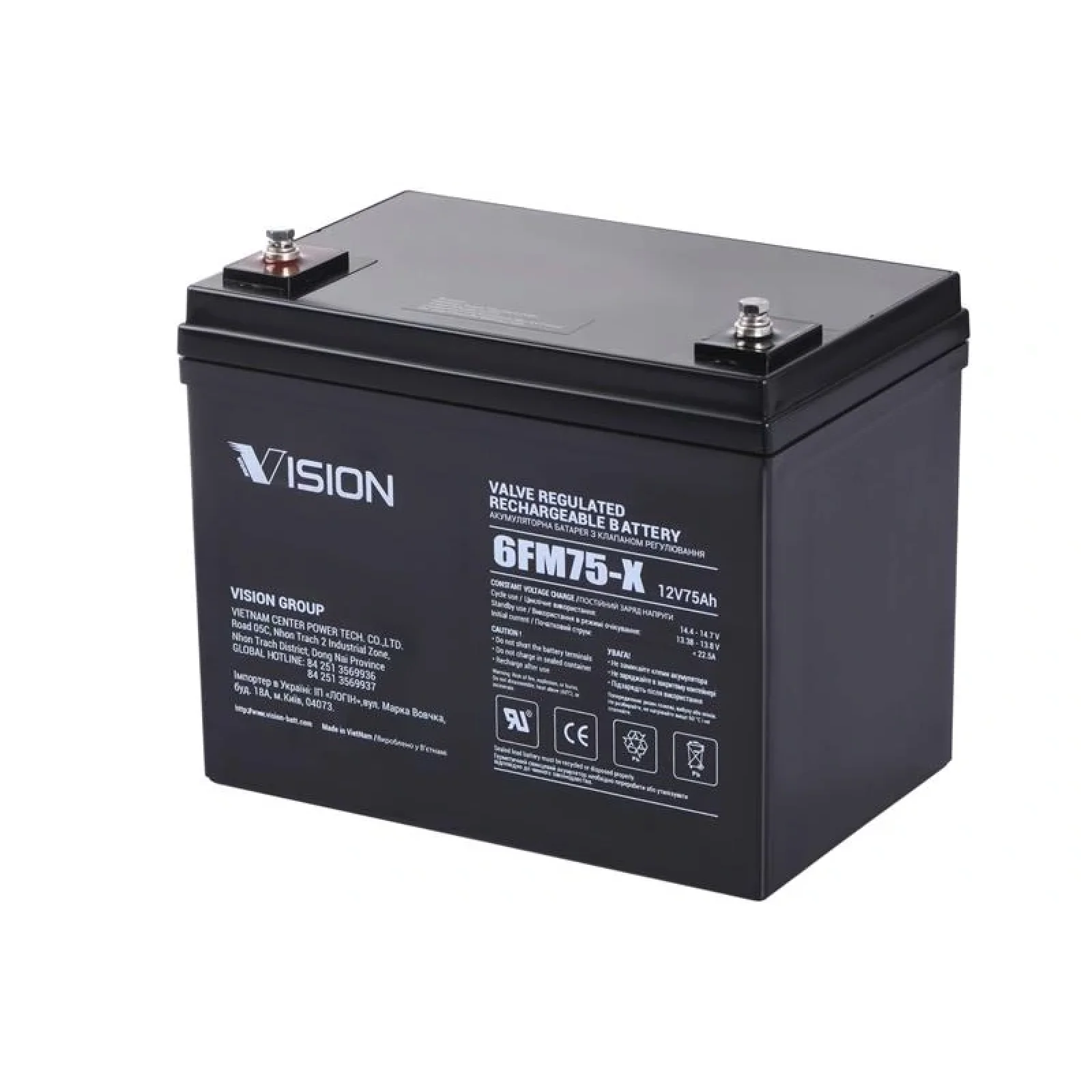 <p><strong>6FM75-X</strong><br /> 12В 75Ач (С10)<br /> Тип: VRLA AGM<br /> Термін служби: 10 років (у буферному режимі)<br /> Габарити (ВхШхГ): 215х166х258 мм<br /> Вага: 22.5 кг<br /> Гарантія: 12 міс.<br /> Комплектація: к-т болтів для борнів M6<br /> Рекомендована температура навколишнього середовища 25±3?<br /> Саморозряд при 20 С (% за місяць) – 3<br /> Середня ємність батареї у буферному режимі через 10 років експлуатації % - 75<br /> Цикли заряд/розряд при глибині розряду (%)<br /> d.o.d 100% - 240<br /> d.o.d 50% - 480<br /> d.o.d 30% - 1300</p> <p><strong>Вимоги до умов експлуатації</strong><br /> Батареї призначені для роботи у буферному режимі та у разі аварійного відключення мережі для забезпечення безперебійного електроживлення промислового та IT обладнання, аварійного освітлення, систем безпеки тощо.<br /> <strong>Не призначені до роботи в циклічному режимі </strong>в автономних системах електроживлення, живлення приводів електротранспорту тощо.</p>